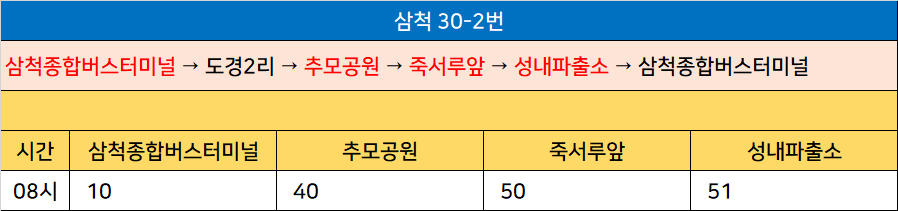 삼척 30-2번: 삼척종합버스터미널 → 도경2리 → 추모공원 → 죽서루앞 → 성내파출소 → 삼척종합버스터미널
