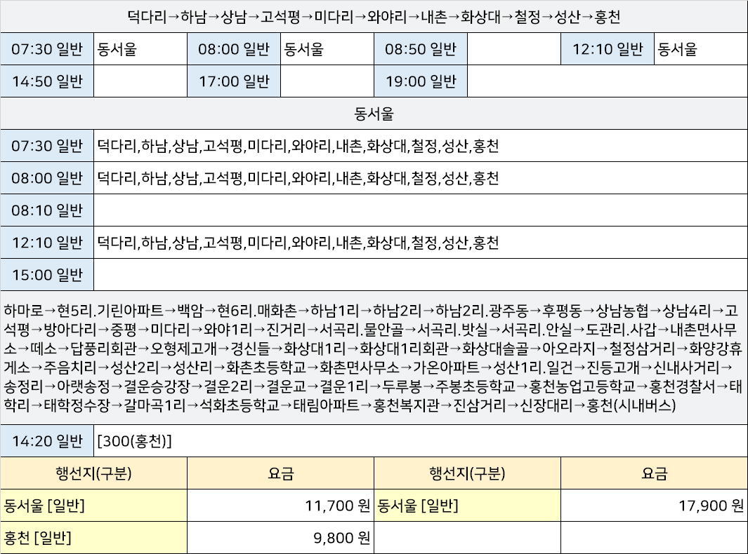 현리시외고속버스터미널 현리정류장 현리정류소 → "덕다리→하남→상남→고석평→미다리→와야리→내촌→화상대→철정→성산→홍천,동서울,하마로→현5리.기린아파트→백암→현6리.매화촌→하남1리→하남2리→하남2리.광주동→후평동→상남농협→상남4리→고석평→방아다리→중평→미다리→와야1리→진거리→서곡리.물안골→서곡리.밧실→서곡리.안실→도관리.사갑→내촌면사무소→떼소→답풍리회관→오형제고개→경신들→화상대1리→화상대1리회관→화상대솔골→아오라지→철정삼거리→화양강휴게소→주음치리→성산2리→성산리→화촌초등학교→화촌면사무소→가온아파트→성산1리.일건→진등고개→신내사거리→송정리→아랫송정→결운승강장→결운2리→결운교→결운1리→두루봉→주봉초등학교→홍천농업고등학교→홍천경찰서→태학리→태학정수장→갈마곡1리→석화초등학교→태림아파트→홍천복지관→진삼거리→신장대리→홍천(시내버스)".