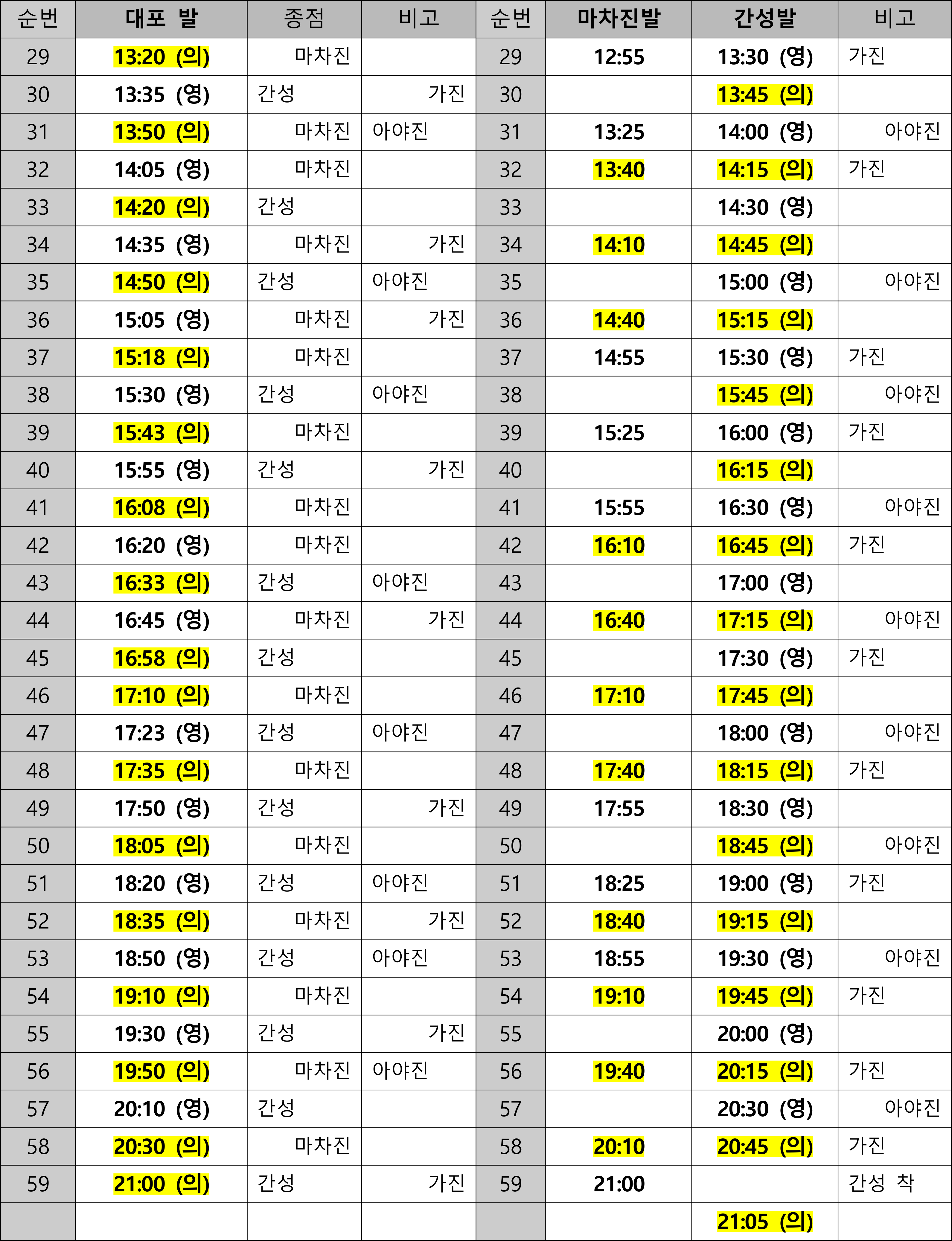 대포항→ 간성(1번 시내버스), 대포항→거진, 마차진(1-1번 시내버스) 시간표