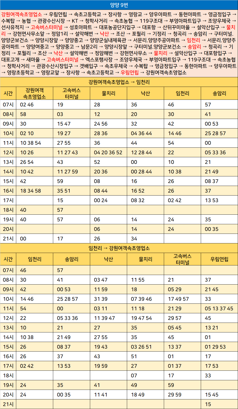 양양 9번: 강원여객속초영업소 → 우림연립 → 속초고등학교 → 장사항 → 영랑교 → 양우아파트 → 동현아파트 → 영금정입구 → 수복탑 → 농협 → 관광수산시장 → KT → 청학사거리 → 속초농협 → 119구조대 → 부영아파트입구 → 조양우체국 → 선사유적지 → 고속버스터미널 → 성호아파트 → 대포농공단지입구 → 대포항 → 산뒤꾸미마을 → 설악산입구 → 물치리 → 강현면사무소앞 → 정암1리 → 설악해변 → 낙산 → 조산 → 포월리 → 기정리 → 청곡리 → 송암리 → 구터미널.양양군보건소 → 양양시장앞 → 양양중고 → 양양군실내체육관 → 서문리.양양주공아파트 → 임천리 → 서문리.양양주공아파트 → 양양여중고 → 양양중고 → 남문2리 → 양양시장앞 → 구터미널.양양군보건소 → 송암리 → 청곡리 → 기정리 → 포월리 → 조산 → 낙산 → 설악해변 → 정암해변 → 강현면사무소 → 물치리 → 설악산입구 → 대포항입구 → 대포고개 → 새마을 → 고속버스터미널 → 엑스포행사장 → 조양우체국 → 부영아파트입구 → 119구조대 → 속초농협 → 청학사거리 → 관광수산시장입구 → 갯배입구 → 속초우체국 → 수복탑 → 영금정입구 → 동현아파트 → 양우아파트 → 영랑초등학교 → 영랑교앞 → 장사항 → 속초고등학교 → 우림연립 → 강원여객속초영업소