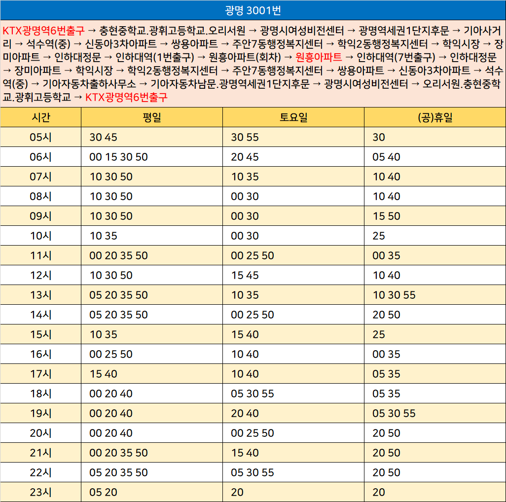 광명 3001번: KTX광명역6번출구 → 충현중학교.광휘고등학교.오리서원 → 광명시여성비전센터 → 광명역세권1단지후문 → 기아사거리 → 석수역(중) → 신동아3차아파트 → 쌍용아파트 → 주안7동행정복지센터 → 학익2동행정복지센터 → 학익시장 → 장미아파트 → 인하대정문 → 인하대역(1번출구) → 원흥아파트(회차) → 원흥아파트 → 인하대역(7번출구) → 인하대정문 → 장미아파트 → 학익시장 → 학익2동행정복지센터 → 주안7동행정복지센터 → 쌍용아파트 → 신동아3차아파트 → 석수역(중) → 기아자동차출하사무소 → 기아자동차남문.광명역세권1단지후문 → 광명시여성비전센터 → 오리서원.충현중학교.광휘고등학교 → KTX광명역6번출구