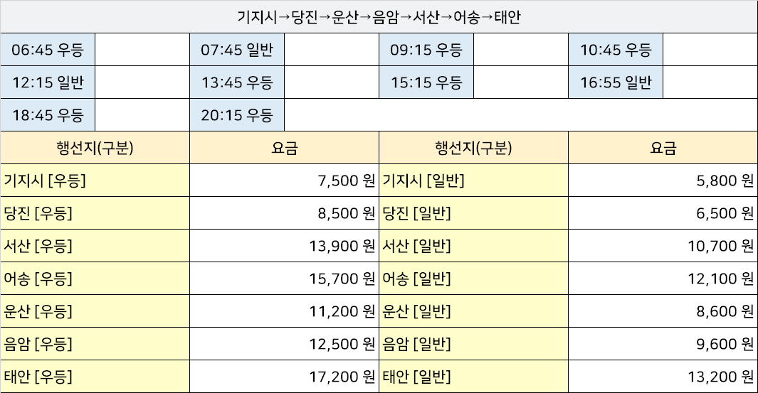 광명종합시외고속버스터미널 광명정류장 광명정류소 → "기지시→당진→운산→음암→서산→어송→태안".