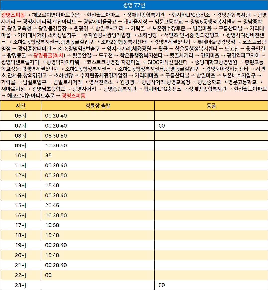 광명 77번: 광명스피돔 → 해모로이연아파트후문 → 현진월드아파트 → 장애인종합복지관 → 헵시바LPG충전소 → 광명종합복지관 → 광명사거리 → 광명사거리역.한진아파트 → 광남새마을금고 → 새마을시장 → 명문고등학교 → 광명6동행정복지센터 → 광남중학교.광명교육청 → 광명돔경륜장 → 원광명 → 밤일로사거리 → 가락골 → 노온정수장후문 → 밤일마을 → 구름산터널 → 가리대마을 → 가리대사거리.소하상업지구 → 수자원공사광명가압장 → 소하성당 → 서면초.안서중.창의경영고 → 광명시여성비전센터 → 소하2동행정복지센터.광명동굴길입구 → 소하2동행정복지센터 → 광명역세권5단지 → 롯데아울렛광명점 → 코스트코광명점 → 광명종합터미널 → KTX광명역8번출구 → 양지사거리.체육공원 → 뒷골 → 학온동행정복지센터 → 도고천 → 뒷골안길 → 광명동굴 → 광명동굴(회차) → 뒷골안길 → 도고천 → 학온동행정복지센터 → 뒷골사거리 → 양지마을 → 광명역파크자이 → 광명역센트럴자이 → 광명역자이타워 → 코스트코광명점.자경마을 → GIDC지식산업센터 → 중앙대학교광명병원 → 충현고등학교정문.광명역세권5단지 → 소하2동행정복지센터 → 소하2동행정복지센터.광명동굴길입구 → 광명시여성비전센터 → 서면초.안서중.창의경영고 → 소하성당 → 수자원공사광명가압장 → 가리대마을 → 구름산터널 → 밤일마을 → 노온배수지입구 → 가락골 → 밤일로입구 → 밤일로사거리 → 영서전력소 → 원광명 → 광남사거리.광명교육청 → 광남중학교 → 명문고등학교 → 새마을시장 → 광명남초등학교 → 광명사거리 → 광명종합복지관 → 헵시바LPG충전소 → 장애인종합복지관 → 현진월드아파트 → 해모로이연아파트후문 → 광명스피돔