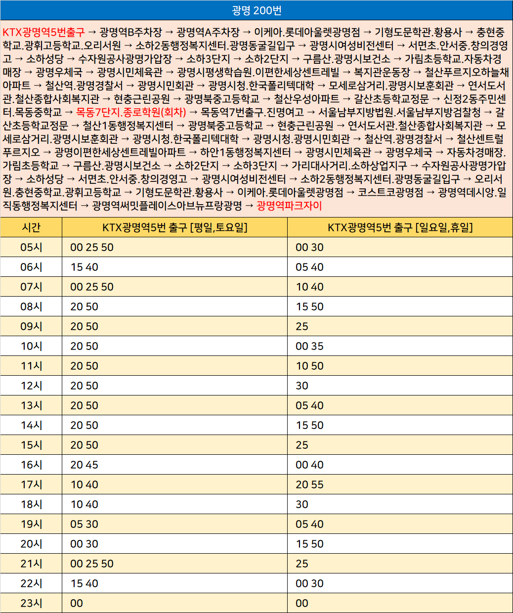 광명 200번: KTX광명역5번출구 → 광명역B주차장 → 광명역A주차장 → 이케아.롯데아울렛광명점 → 기형도문학관.황용사 → 충현중학교.광휘고등학교.오리서원 → 소하2동행정복지센터.광명동굴길입구 → 광명시여성비전센터 → 서면초.안서중.창의경영고 → 소하성당 → 수자원공사광명가압장 → 소하3단지 → 소하2단지 → 구름산.광명시보건소 → 가림초등학교.자동차경매장 → 광명우체국 → 광명시민체육관 → 광명시평생학습원.이편한세상센트레빌 → 복지관운동장 → 철산푸르지오하늘채아파트 → 철산역.광명경찰서 → 광명시민회관 → 광명시청.한국폴리텍대학 → 모세로삼거리.광명시보훈회관 → 연서도서관.철산종합사회복지관 → 현충근린공원 → 광명북중고등학교 → 철산우성아파트 → 갈산초등학교정문 → 신정2동주민센터.목동중학교 → 목동7단지.종로학원(회차) → 목동역7번출구.진명여고 → 서울남부지방법원.서울남부지방검찰청 → 갈산초등학교정문 → 철산1동행정복지센터 → 광명북중고등학교 → 현충근린공원 → 연서도서관.철산종합사회복지관 → 모세로삼거리.광명시보훈회관 → 광명시청.한국폴리텍대학 → 광명시청.광명시민회관 → 철산역.광명경찰서 → 철산센트럴푸르지오 → 광명이편한세상센트레빌아파트 → 하안1동행정복지센터 → 광명시민체육관 → 광명우체국 → 자동차경매장.가림초등학교 → 구름산.광명시보건소 → 소하2단지 → 소하3단지 → 가리대사거리.소하상업지구 → 수자원공사광명가압장 → 소하성당 → 서면초.안서중.창의경영고 → 광명시여성비전센터 → 소하2동행정복지센터.광명동굴길입구 → 오리서원.충현중학교.광휘고등학교 → 기형도문학관.황용사 → 이케아.롯데아울렛광명점 → 코스트코광명점 → 광명역데시앙.일직동행정복지센터 → 광명역써밋플레이스아브뉴프랑광명 → 광명역파크자이