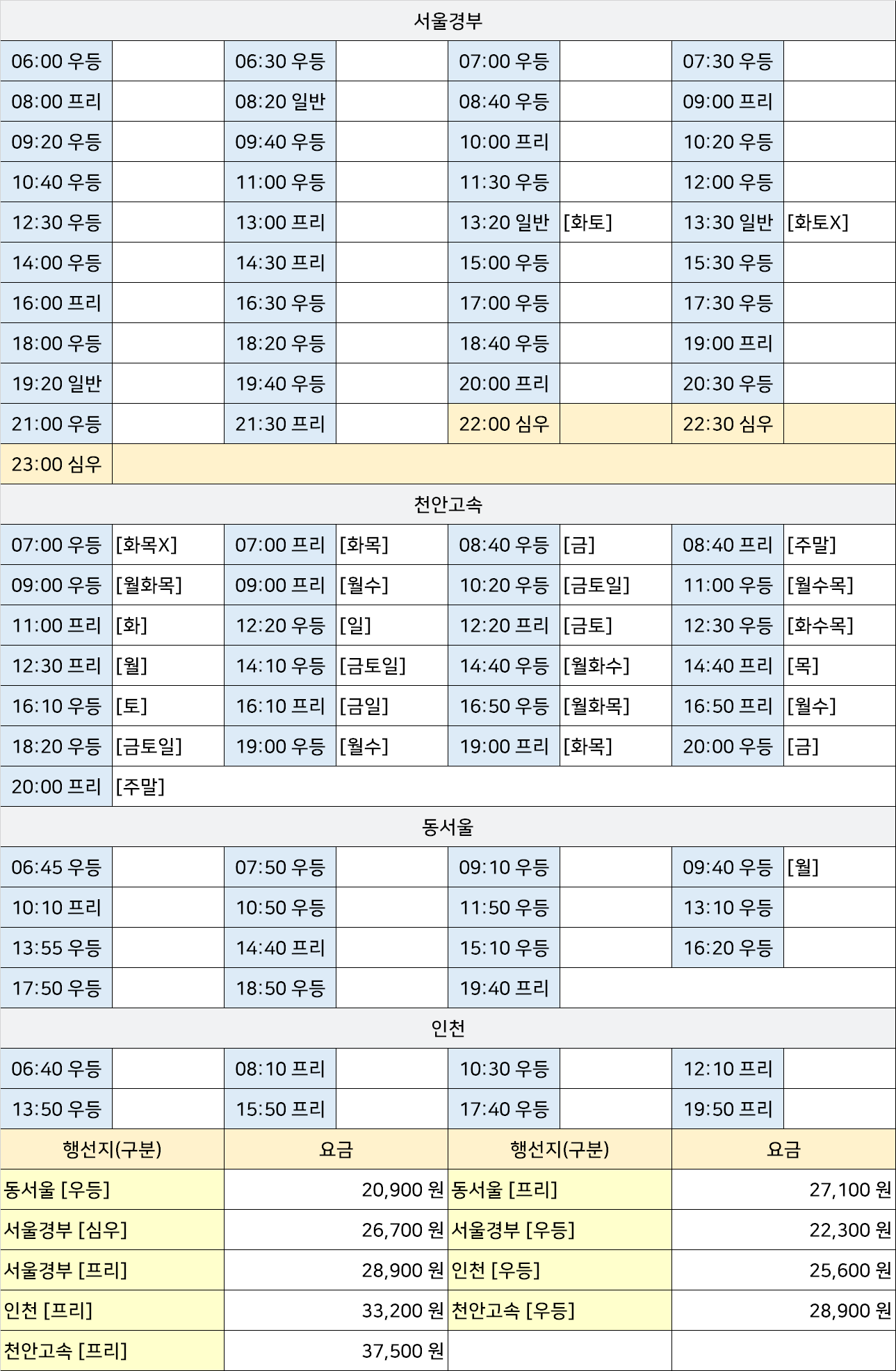 속초 고속버스 터미널 시간표/요금표 2025년 10월 13일 기준