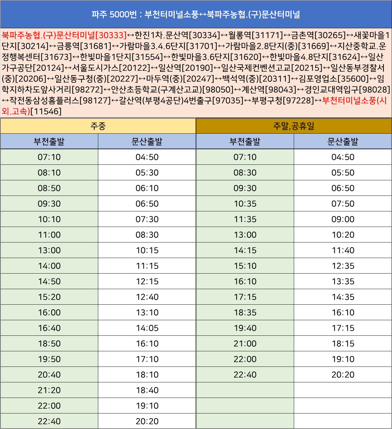 파주 5000번 : 부천터미널소풍↔북파주농협.(구)문산터미널