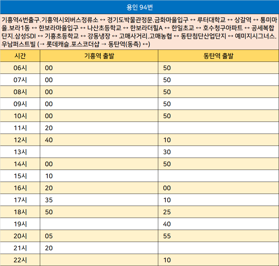 용인 94번: 기흥역4번출구.기흥역시외버스정류소 ↔ 경기도박물관정문.금화마을입구 ↔ 루터대학교 ↔ 상갈역 ↔ 통미마을.보라1동 ↔ 한보라마을입구 ↔ 나산초등학교 ↔ 한보라더힐A ↔ 한일초교 ↔ 호수청구아파트 ↔ 공세복합단지.삼성SDI ↔ 기흥초등학교 ↔ 강동냉장 ↔ 고매사거리.고매농협 ↔ 동탄첨단산업단지 ↔ 예미지시그너스.우남퍼스트빌 (→ 롯데캐슬.포스코더샵 → 동탄역(동측) ↔)