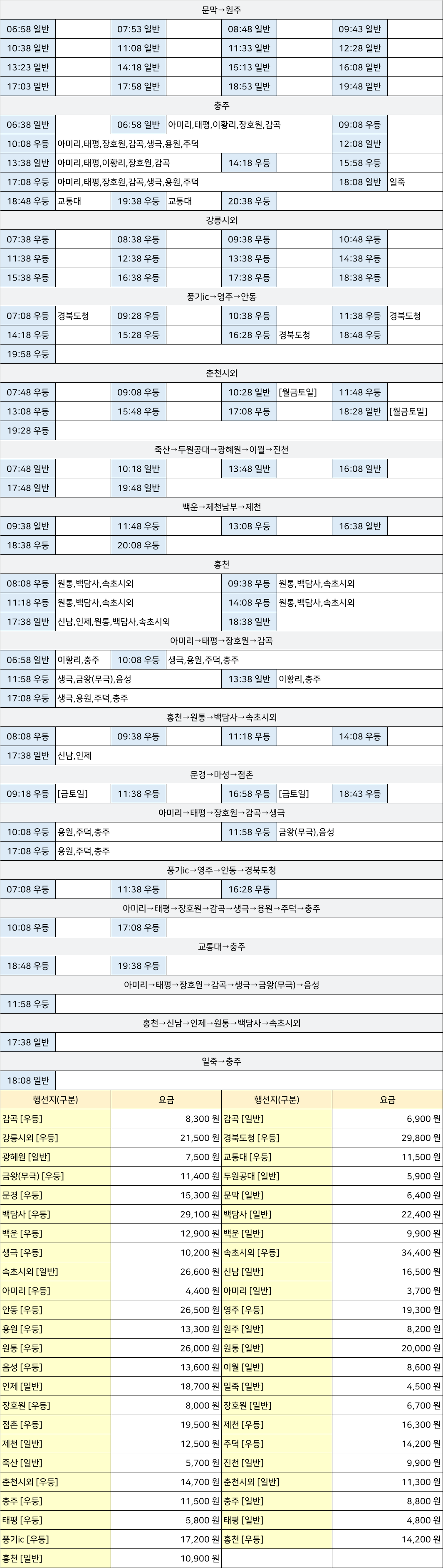 우만동 시외버스 정류장 시간표/요금표 2025년 04월 17일 기준