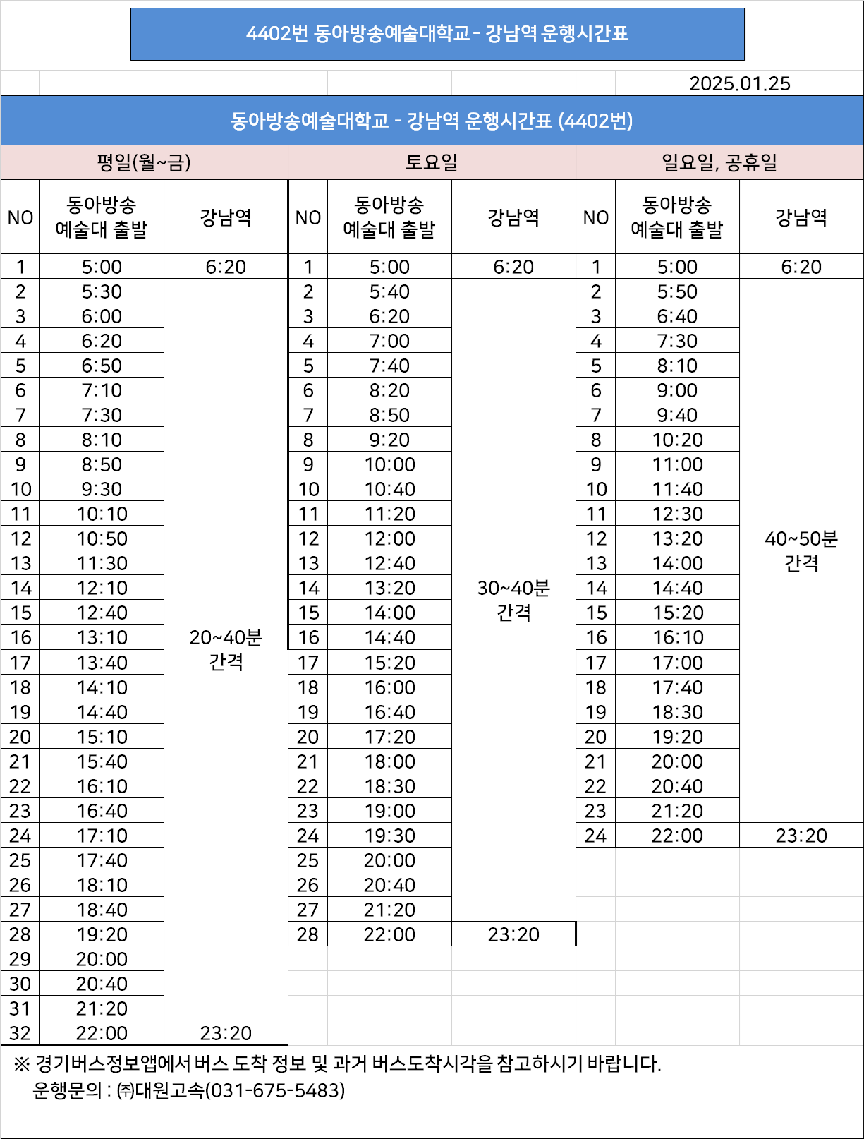 안성 4402번: 동아방송예술대정류장 ↔ 동아방송예술대학교입구 ↔ 안성종합버스터미널앞 ↔ 안성제2산업단지교차로 ↔ 매헌시민의숲.양재꽃시장 ↔ 말죽거리공원사거리 ↔ 양재역.서초문화예술회관 ↔ 뱅뱅사거리 ↔ 래미안아파트.파이낸셜뉴스 ↔ 신분당선강남역