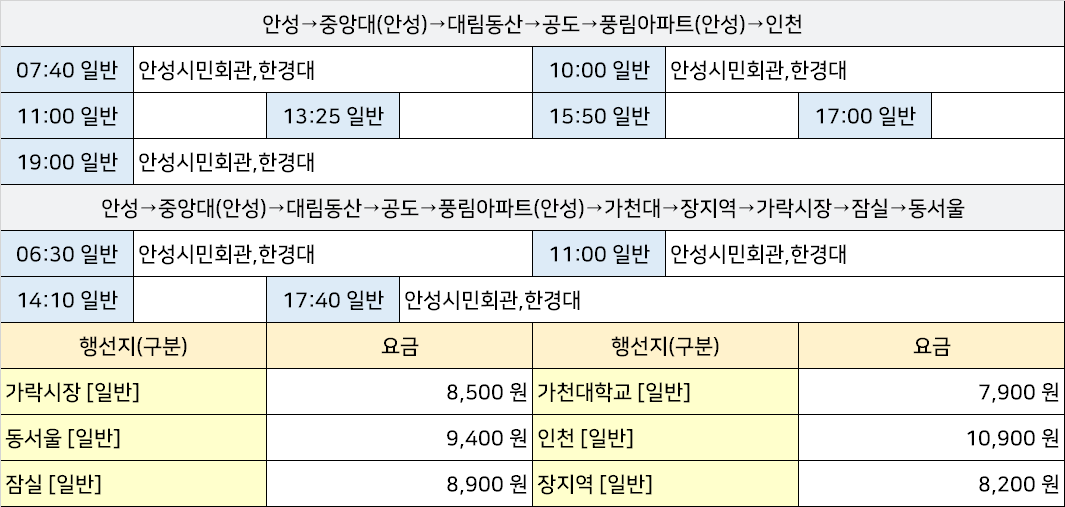 | 안성시민회관시외고속버스터미널 시간표 [안성시민회관정류장 안성시민회관정류소 낙원동터미널] (0) | 2025.04.10 |