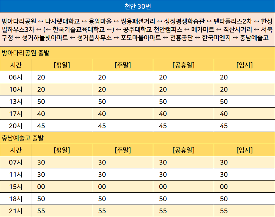 천안 30번: 방아다리공원 ↔ 나사렛대학교 ↔ 용암마을 ↔ 쌍용패션거리 ↔ 성정평생학습관 ↔ 펜타폴리스2차 ↔ 한성필하우스3차 ↔ (← 한국기술교육대학교 ←) ↔ 공주대학교 천안캠퍼스 ↔ 메가마트 ↔ 직산사거리 ↔ 서북구청 ↔ 성거하늘빛아파트 ↔ 성거읍사무소 ↔ 포도마을아파트 ↔ 천흥공단 ↔ 한국피엔지 ↔ 충남예술고
