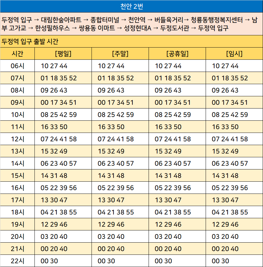 천안 2번: 두정역 입구 → 대림한숲아파트 → 종합터미널 → 천안역 → 버들육거리→ 청룡동행정복지센터 → 남부 고가교 → 한성필하우스 → 쌍용동 이마트 → 성정현대A → 두정도서관 → 두정역 입구
