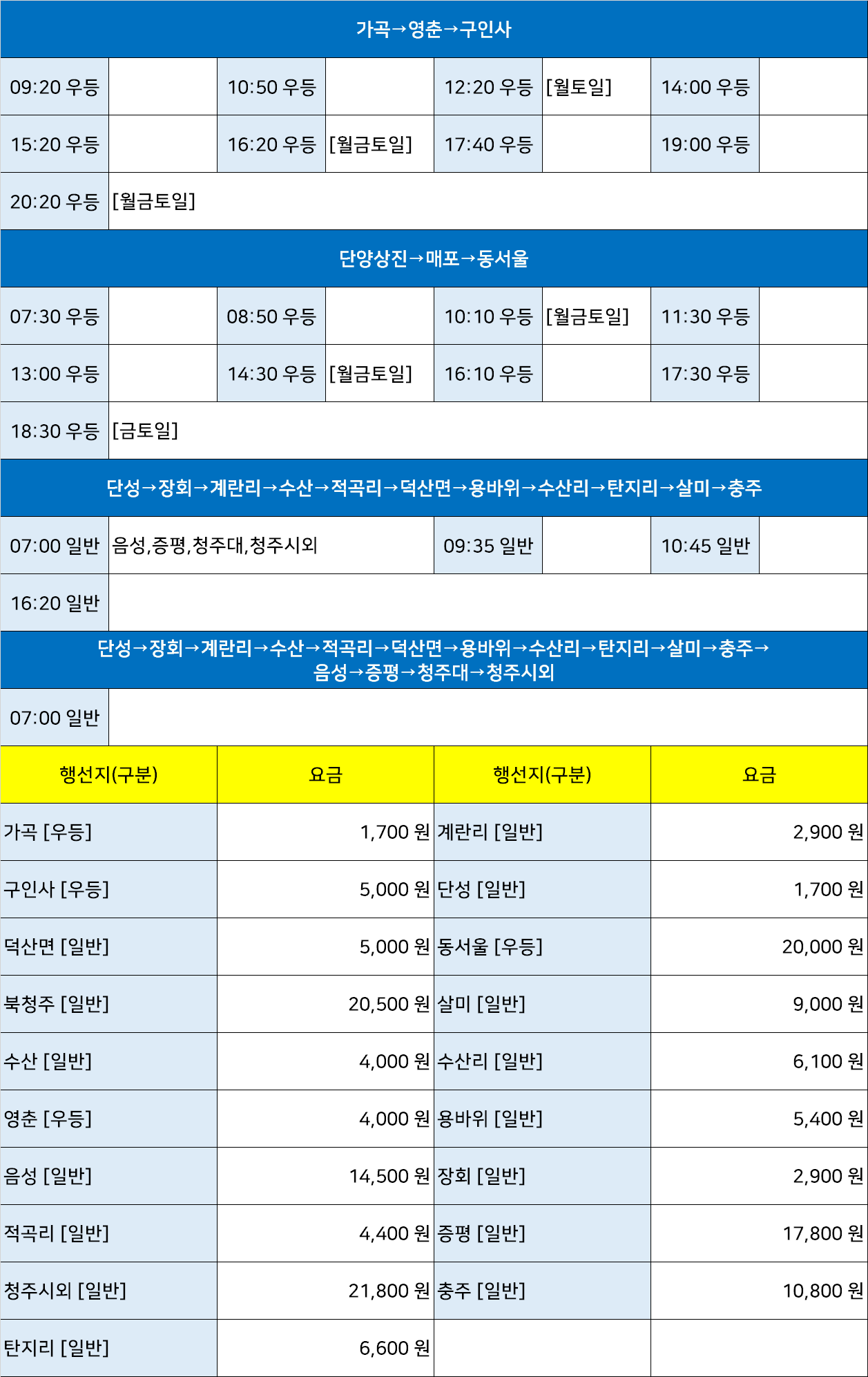 단양시외버스공용터미널 단양시외버스터미널 단양버스공용터미널 단양버스터미널 단양터미널 → "가곡→영춘→구인사,단성→장회→계란리→수산→적곡리→덕산면→용바위→수산리→탄지리→살미→충주→음성→증평→청주대→청주시외,단양상진→매포→동서울".