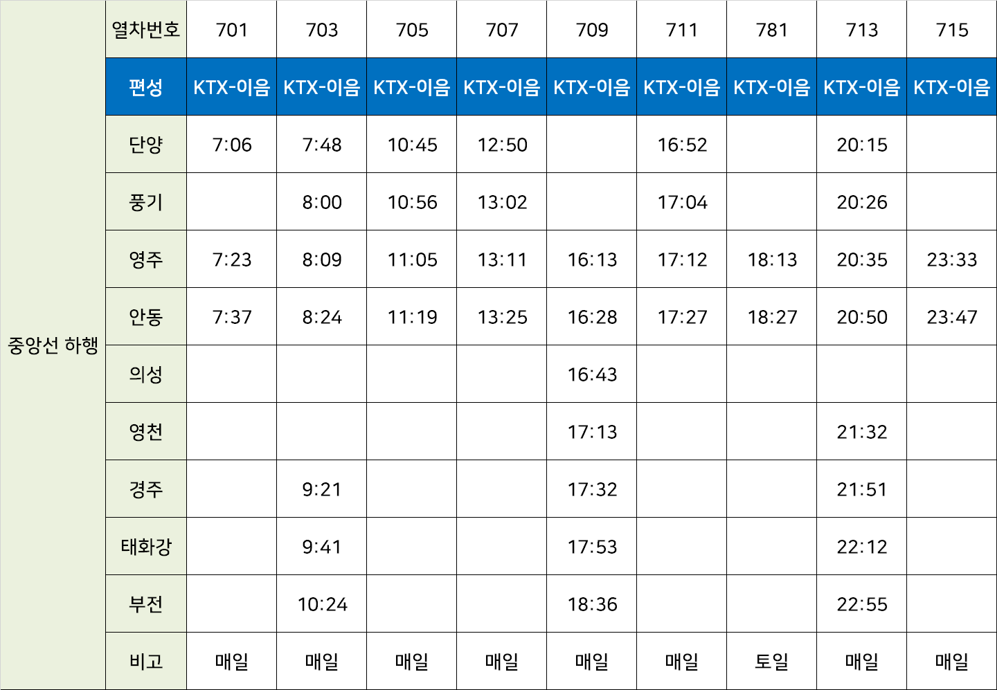 하행 기차 시간표