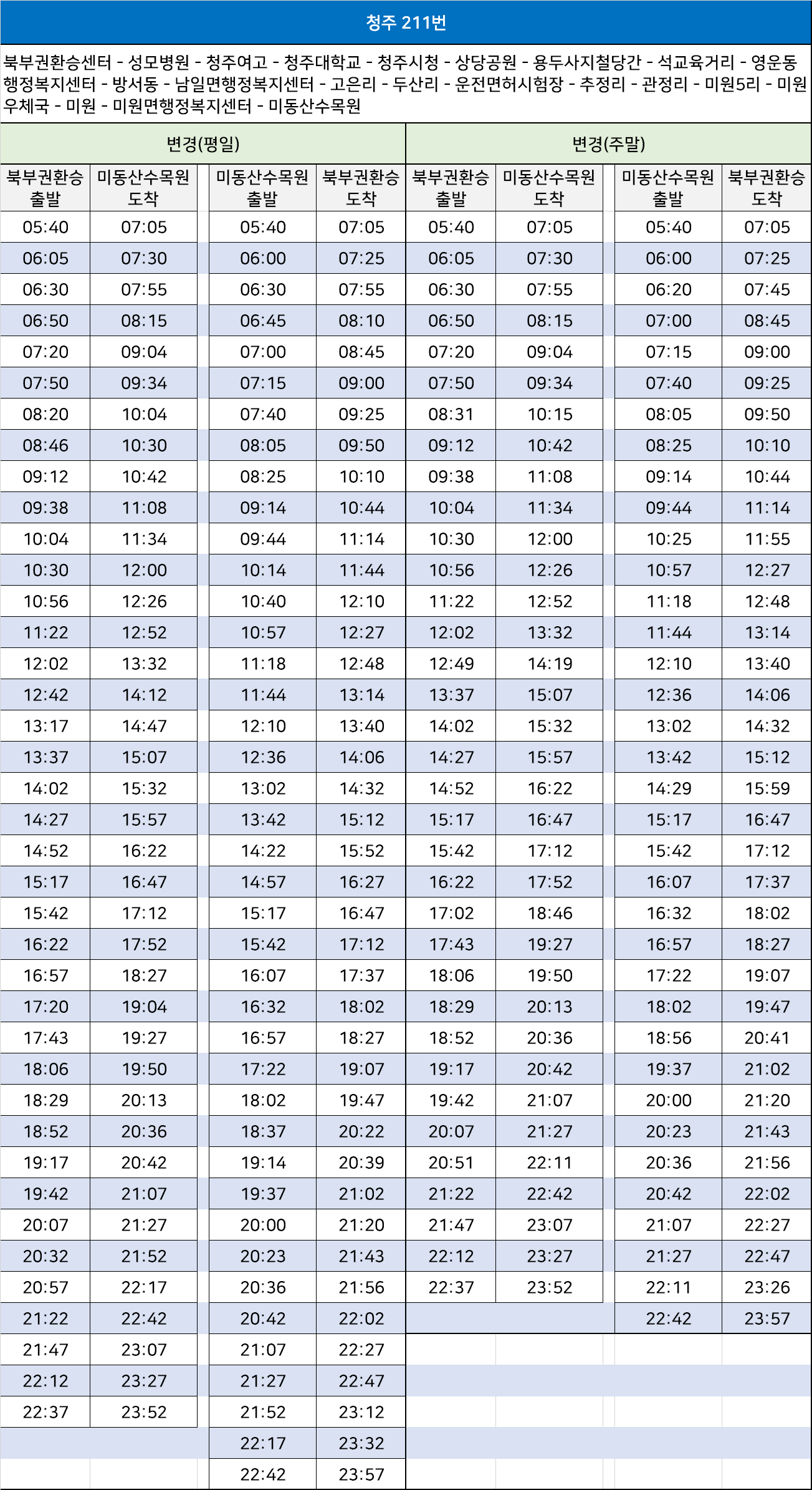 청주 211번 시내버스 시간표: 올챙이국 근처 승차장