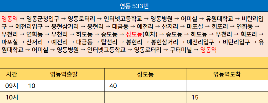 영동 533번: 영동역 → 영동군청입구 → 영동로터리 → 인터넷고등학교 → 영동병원 → 어미실 → 유원대학교 → 비탄리입구 → 예전리입구 → 봉현삼거리 → 봉현리 → 대금동 → 예전리 → 산저리 → 마포실 → 회포리 → 연화동 → 우천리 → 연화동 → 우천리 → 하도동 → 중도동 → 상도동(회차) → 중도동 → 하도동 → 우천리 → 회포리 → 마포실 → 산저리 → 예전리 → 대금동 → 탑선리 → 봉현리 → 봉현삼거리 → 예전리입구 → 비탄리입구 → 유원대학교 → 어미실 → 영동병원 → 인터넷고등학교 → 영동로터리 → 구터미널 → 영동역