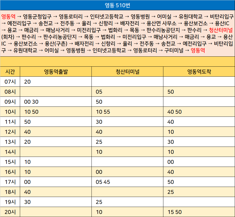 영동 510번: 영동역 → 영동군청입구 → 영동로터리 → 인터넷고등학교 → 영동병원 → 어미실 → 유원대학교 → 비탄리입구 → 예전리입구 → 송천교 → 전주동 → 율리 → 신항리 → 배자전리 → 용산면 사무소 → 용산보건소 → 용산IC → 용교 → 매금리 → 매남사거리 → 미전리입구 → 법화리 → 목동 → 판수리농공단지 → 판수리 → 청산터미널(회차) → 판수리 → 판수리농공단지 → 목동 → 법화리 → 미전리입구 → 매남사거리 → 매금리 → 용교 → 용산IC → 용산보건소 → 용산(구촌) → 배자전리 → 신항리 → 율리 → 전주동 → 송천교 → 예전리입구 → 비탄리입구 → 유원대학교 → 어미실 → 영동병원 → 인터넷고등학교 → 영동로터리 → 구터미널 → 영동역