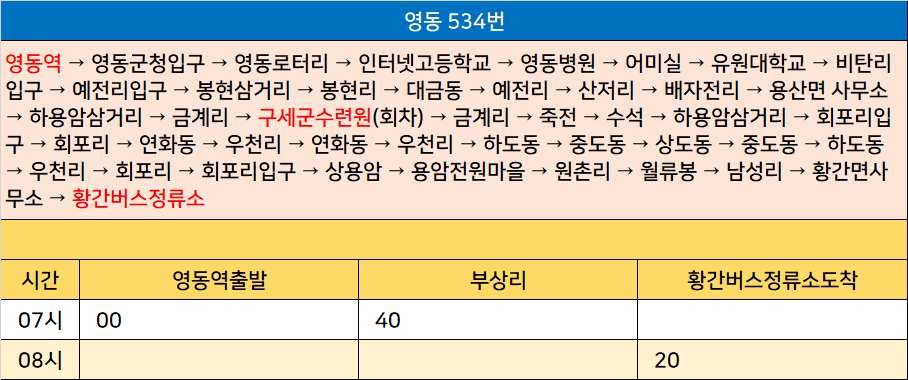 영동 534번: 영동역 → 영동군청입구 → 영동로터리 → 인터넷고등학교 → 영동병원 → 어미실 → 유원대학교 → 비탄리입구 → 예전리입구 → 봉현삼거리 → 봉현리 → 대금동 → 예전리 → 산저리 → 배자전리 → 용산면 사무소 → 하용암삼거리 → 금계리 → 구세군수련원(회차) → 금계리 → 죽전 → 수석 → 하용암삼거리 → 회포리입구 → 회포리 → 연화동 → 우천리 → 연화동 → 우천리 → 하도동 → 중도동 → 상도동 → 중도동 → 하도동 → 우천리 → 회포리 → 회포리입구 → 상용암 → 용암전원마을 → 원촌리 → 월류봉 → 남성리 → 황간면사무소 → 황간버스정류소