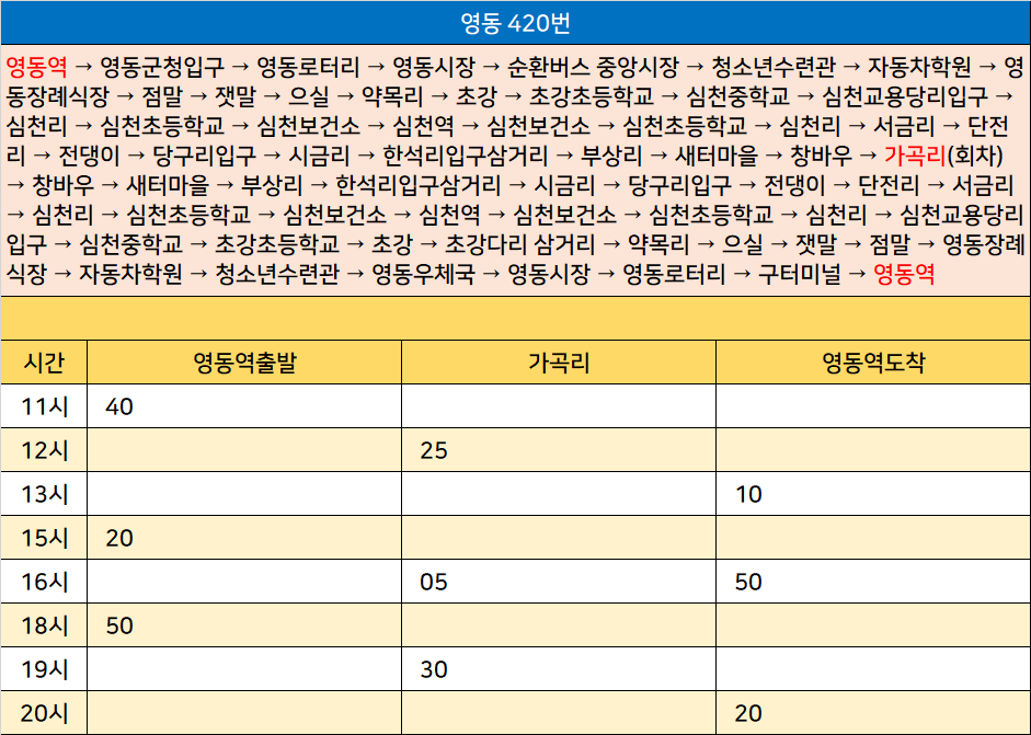 영동 420번: 영동역 → 영동군청입구 → 영동로터리 → 영동시장 → 순환버스 중앙시장 → 청소년수련관 → 자동차학원 → 영동장례식장 → 점말 → 잿말 → 으실 → 약목리 → 초강 → 초강초등학교 → 심천중학교 → 심천교용당리입구 → 심천리 → 심천초등학교 → 심천보건소 → 심천역 → 심천보건소 → 심천초등학교 → 심천리 → 서금리 → 단전리 → 전댕이 → 당구리입구 → 시금리 → 한석리입구삼거리 → 부상리 → 새터마을 → 창바우 → 가곡리(회차) → 창바우 → 새터마을 → 부상리 → 한석리입구삼거리 → 시금리 → 당구리입구 → 전댕이 → 단전리 → 서금리 → 심천리 → 심천초등학교 → 심천보건소 → 심천역 → 심천보건소 → 심천초등학교 → 심천리 → 심천교용당리입구 → 심천중학교 → 초강초등학교 → 초강 → 초강다리 삼거리 → 약목리 → 으실 → 잿말 → 점말 → 영동장례식장 → 자동차학원 → 청소년수련관 → 영동우체국 → 영동시장 → 영동로터리 → 구터미널 → 영동역