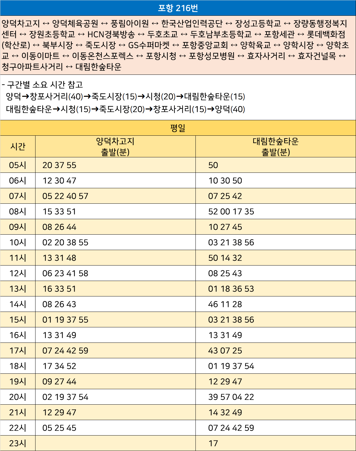 포항 216번: 양덕차고지 ↔ 양덕체육공원 ↔ 풍림아이원 ↔ 한국산업인력공단 ↔ 장성고등학교 ↔ 장량동행정복지센터 ↔ 장원초등학교 ↔ HCN경북방송 ↔ 두호초교 ↔ 두호남부초등학교 ↔ 포항세관 ↔ 롯데백화점(학산로) ↔ 북부시장 ↔ 죽도시장 ↔ GS수퍼마켓 ↔ 포항중앙교회 ↔ 양학육교 ↔ 양학시장 ↔ 양학초교 ↔ 이동이마트 ↔ 이동온천스포렉스 ↔ 포항시청 ↔ 포항성모병원 ↔ 효자사거리 ↔ 효자건널목 ↔ 청구아파트사거리 ↔ 대림한숲타운
