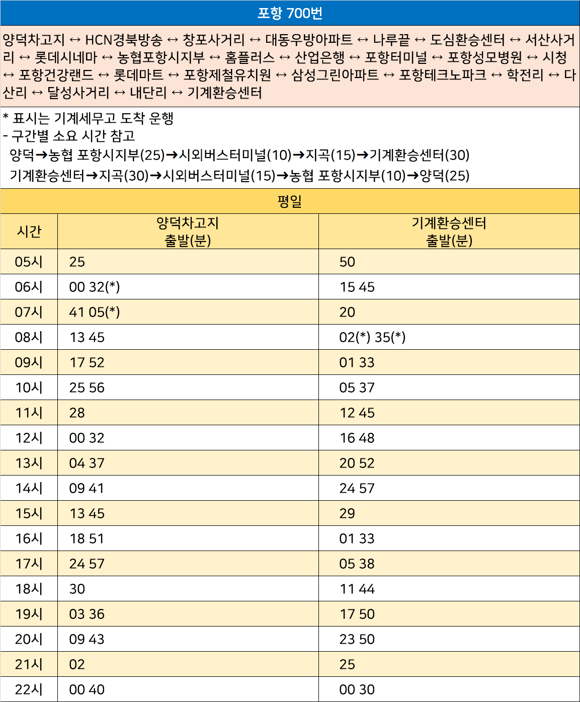 포항 700번: 양덕차고지 ↔ HCN경북방송 ↔ 창포사거리 ↔ 대동우방아파트 ↔ 나루끝 ↔ 도심환승센터 ↔ 서산사거리 ↔ 롯데시네마 ↔ 농협포항시지부 ↔ 홈플러스 ↔ 산업은행 ↔ 포항터미널 ↔ 포항성모병원 ↔ 시청 ↔ 포항건강랜드 ↔ 롯데마트 ↔ 포항제철유치원 ↔ 삼성그린아파트 ↔ 포항테크노파크 ↔ 학전리 ↔ 다산리 ↔ 달성사거리 ↔ 내단리 ↔ 기계환승센터