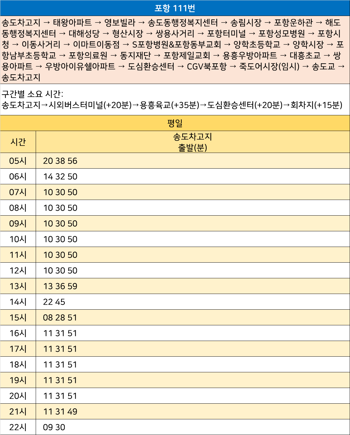 포항 111번: 송도차고지 → 태왕아파트 → 영보빌라 → 송도동행정복지센터 → 송림시장 → 포항운하관 → 해도동행정복지센터 → 대해성당 → 형산시장 → 쌍용사거리 → 포항터미널 → 포항성모병원 → 포항시청 → 이동사거리 → 이마트이동점 → S포항병원&포항동부교회 → 양학초등학교 → 양학시장 → 포항남부초등학교 → 포항의료원 → 동지재단 → 포항제일교회 → 용흥우방아파트 → 대흥초교 → 쌍용아파트 → 우방아이유쉘아파트 → 도심환승센터 → CGV북포항 → 죽도어시장(임시) → 송도교 → 송도차고지