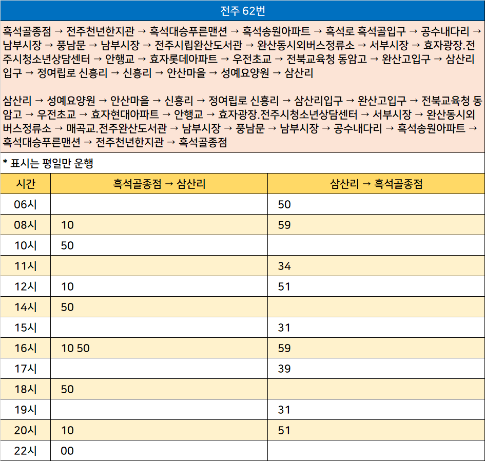 삼산리 → 성예요양원 → 안산마을 → 신흥리 → 정여립로 신흥리 → 호동마을 → 육육걸즈 → 호동마을 → 호동마을 → 육육걸즈 → 석산마을 → 삼산리 → 완산고 → 전북교육청 동암고 → 우전초교 → 효자현대A → 안행교 → 효자광장.전주시청소년상담센터 → 서부시장 → 완산동버스정류소 → 매곡교.전주완산도서관 → 남부시장 → 풍남문 → 남부시장 → 공수내다리 → 흑석송원A → 흑석대승푸른맨션 → 전주천년한지관 → 흑석골종점