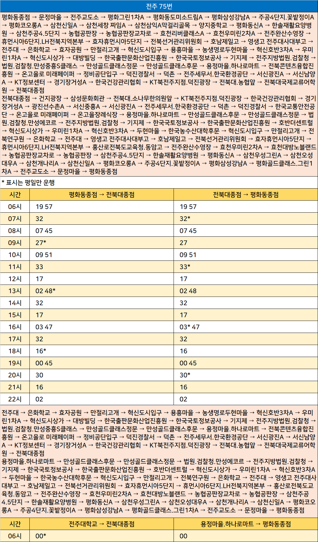 용정마을.하나로마트 → 만성골드클래스후문 → 만성골드클래스정문 → 법원.검찰청.만성에코르 → 전주지방법원.검찰청 → 기지제 → 한국국토정보공사 → 한국출판문화산업진흥원 → 호반더센트럴 → 혁신도시상가 → 우미린1차A → 혁신호반3차A → 두현마을 → 한국농수산대학후문 → 혁신도시 → 만절리고개 → 전북연구원 → 은화 → 전주대 → 영생고 전주대사대부고 → 호남제일고 → 전북선거관리위원회 → 효자휴먼시아5단지 → 휴먼시아6단지.LH전북지역본부 → 홍산로전북도교육청.동암고 → 전주완산수영장 → 효천우미린2차A → 효천대방노블랜드 → 농협공판장교차로 → 농협공판장 → 삼천주공4.5단지 → 한솔재활요양병원 → 평화동신A → 삼천우성그린A → 삼천오성대우A → 삼천개나리A → 삼천신일A → 평화코오롱A → 주공4단지.꽃밭정이A → 평화삼성강남A → 평화골드클래스.그린1차A → 전주교도소 → 문정마을 → 평화동종점