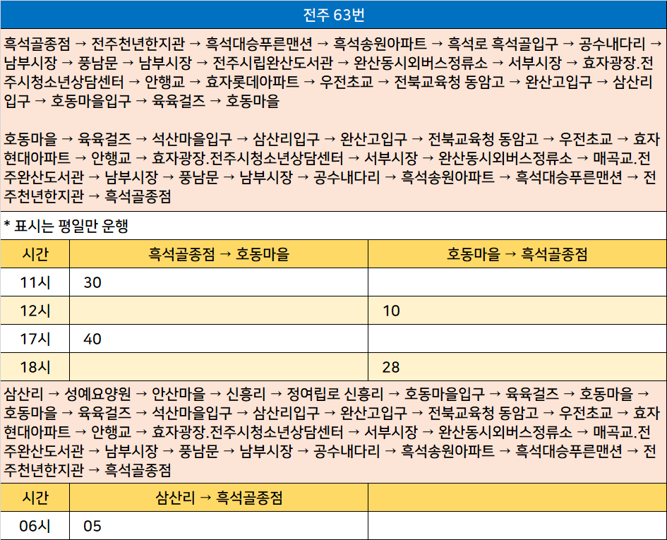 호동마을 → 육육걸즈 → 석산마을 → 삼산리 → 완산고 → 전북교육청 동암고 → 우전초교 → 효자현대A → 안행교 → 효자광장.전주시청소년상담센터 → 서부시장 → 완산동버스정류소 → 매곡교.전주완산도서관 → 남부시장 → 풍남문 → 남부시장 → 공수내다리 → 흑석송원A → 흑석대승푸른맨션 → 전주천년한지관 → 흑석골종점