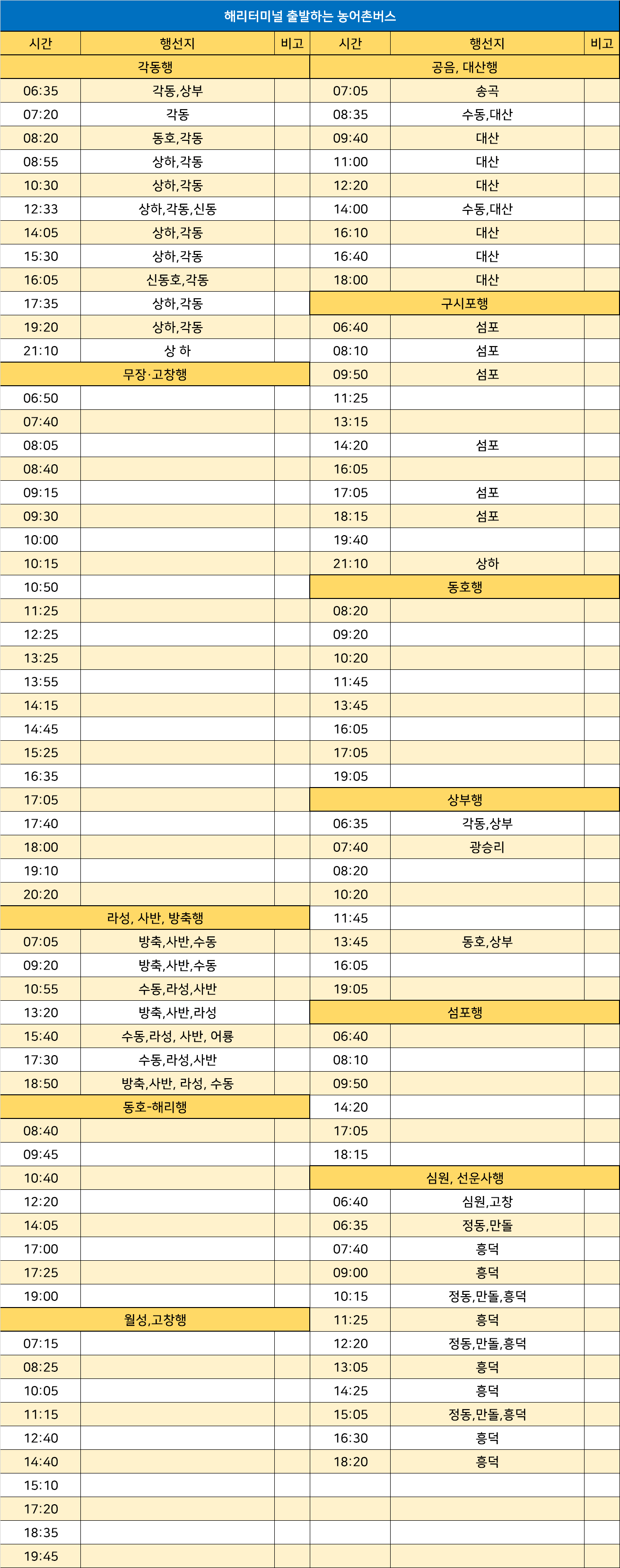 해리 시외버스 터미널 시간표/요금표 2025년 08월 02일 기준