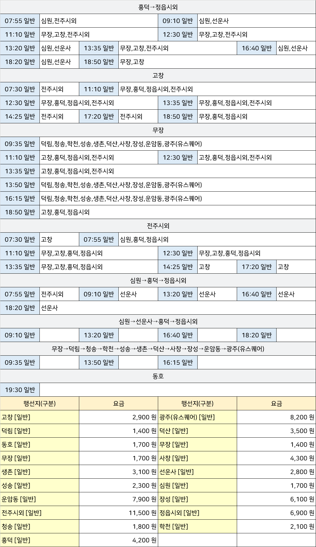 | 흥덕시외고속버스터미널 시간표 [흥덕버스정류장 흥덕버스정류소 흥덕면터미널 흥덕리터미널] (0) | 2025.08.02 |
