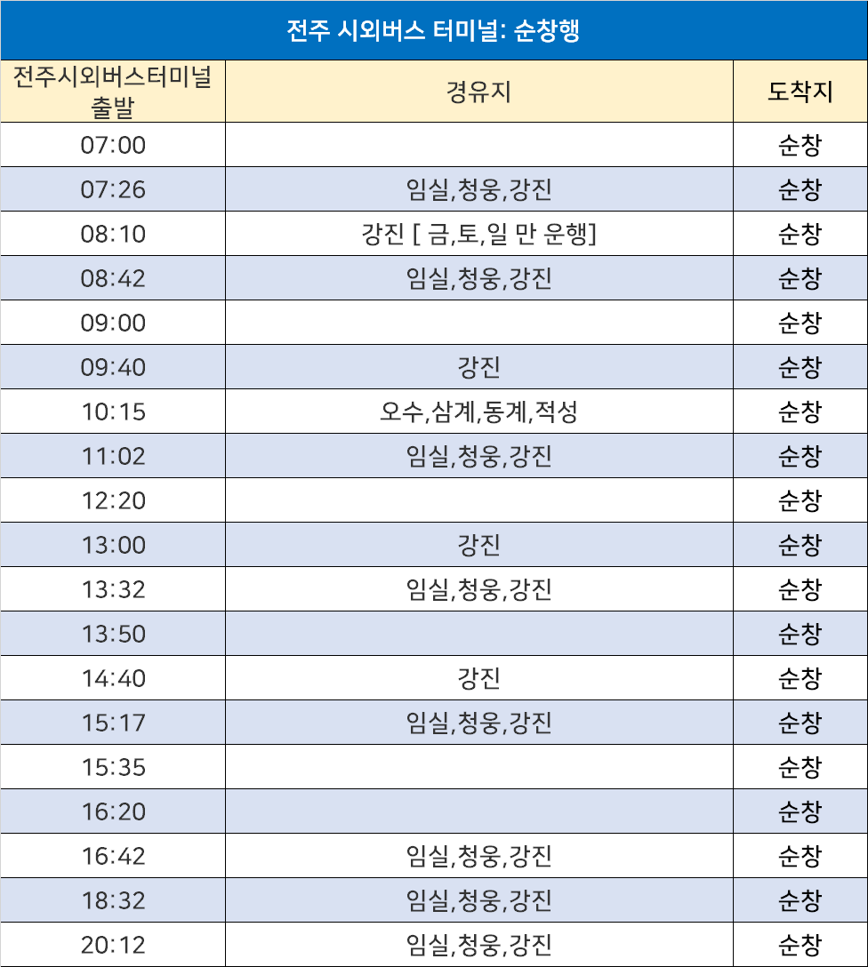 전주 시외버스 터미널에서 순창행 버스 시간표