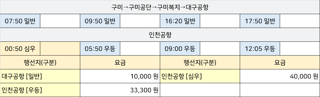김천부곡 공항버스 정류장/요금표 시간표 2025년 07월 25일 기준