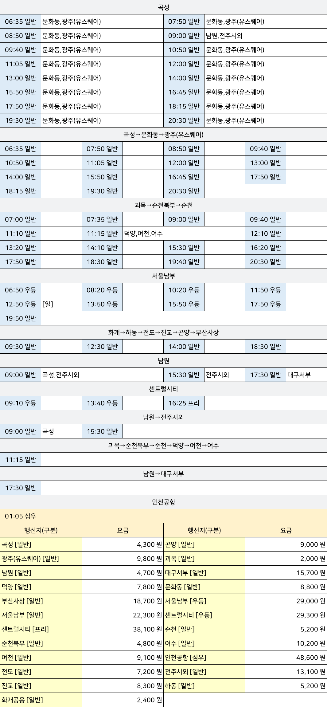 구례공영공항시외고속버스터미널 구례공영공항버스정류장 구례공영공항버스정류소 → "곡성→문화동→광주(유스퀘어),괴목→순천북부→순천→덕양→여천→여수,남원→대구서부,남원→전주시외,서울남부,센트럴시티,인천공항,화개→하동→전도→진교→곤양→부산사상".