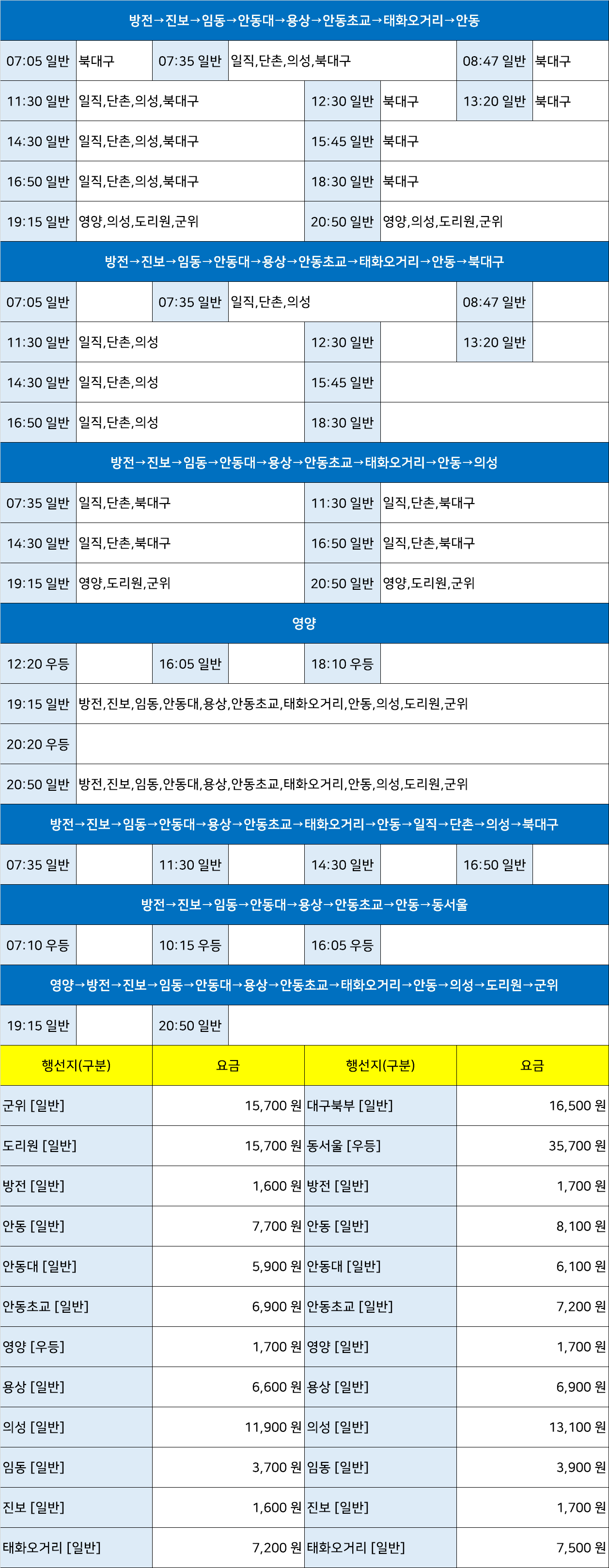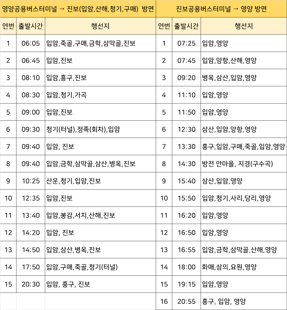 영양공용버스터미널 → 진보(입암,산해,청기,구매) 방면,진보공용버스터미널 → 영양 방면