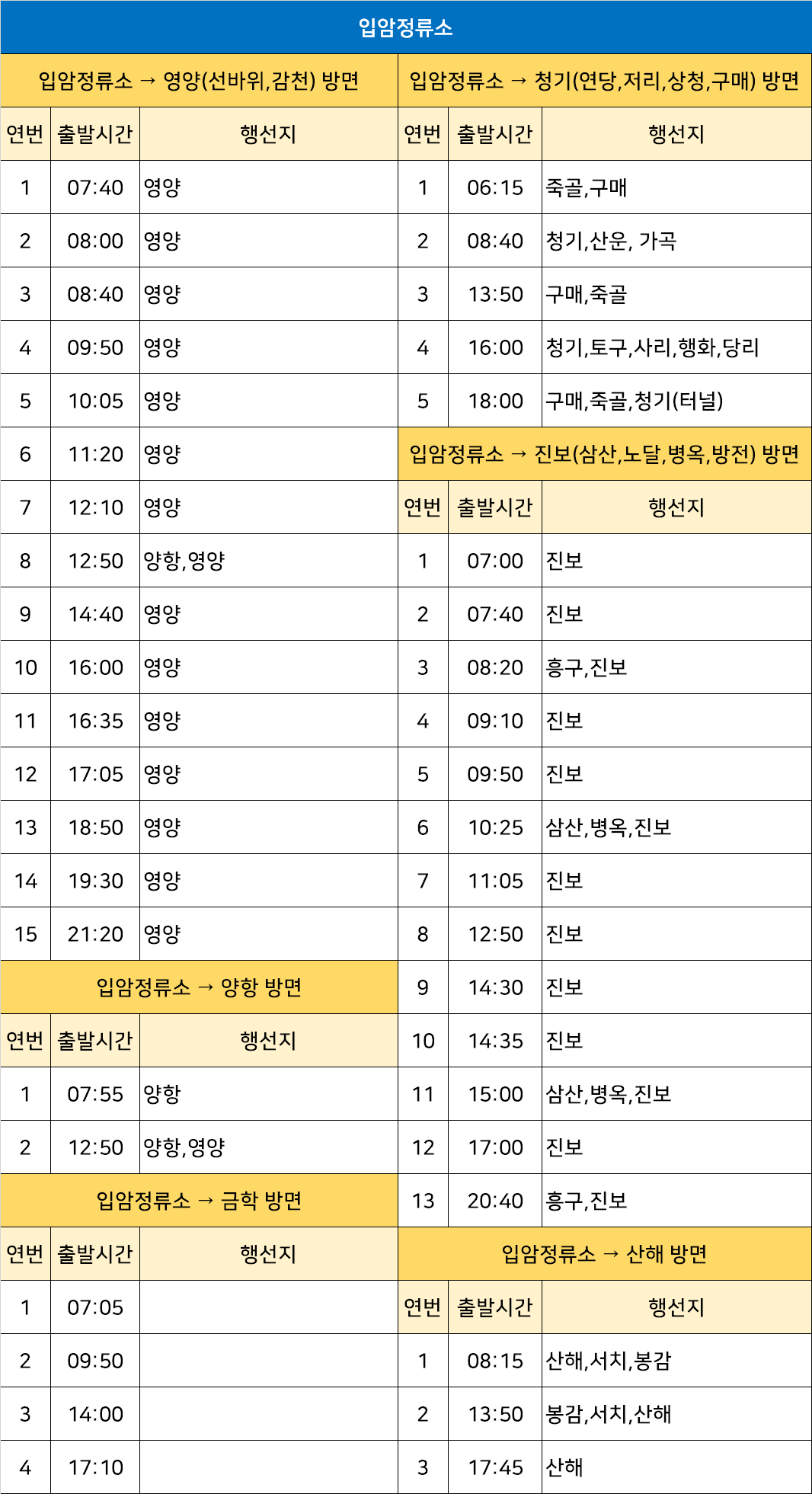 가곡, 구매, 당리, 병옥, 봉감, 사리, 산운, 산해, 삼산, 서치, 양항, 영양, 죽골, 진보, 청기, 청기(터널), 토구, 행화, 흥구 입암정류소 → 영양(선바위,감천) 방면, 입암정류소 → 청기(연당,저리,상청,구매) 방면, 입암정류소 → 진보(삼산,노달,병옥,방전) 방면, 입암정류소 → 양항 방면, 입암정류소 → 금학 방면, 입암정류소 → 산해 방면
