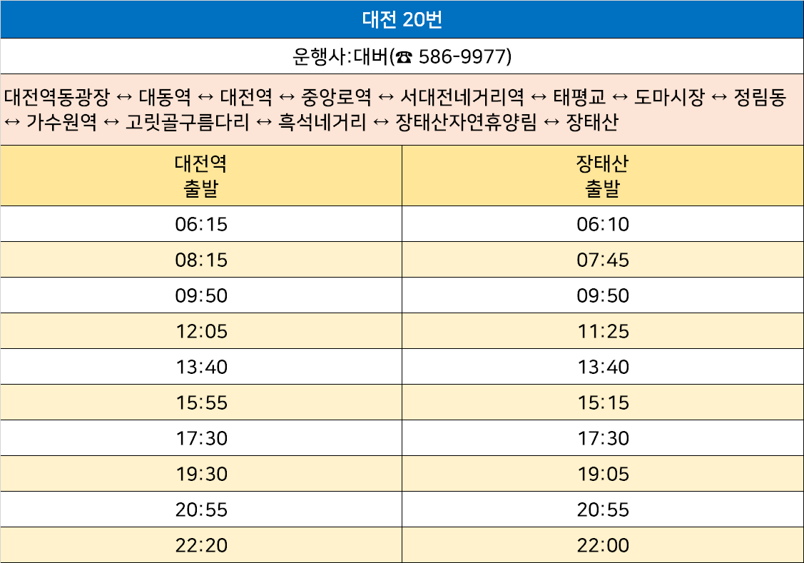 대전 20번: 대전역동광장 ↔ 대동역 ↔ 대전역 ↔ 중앙로역 ↔ 서대전네거리역 ↔ 태평교 ↔ 도마시장 ↔ 정림동 ↔ 가수원역 ↔ 고릿골구름다리 ↔ 흑석네거리 ↔ 장태산자연휴양림 ↔ 장태산