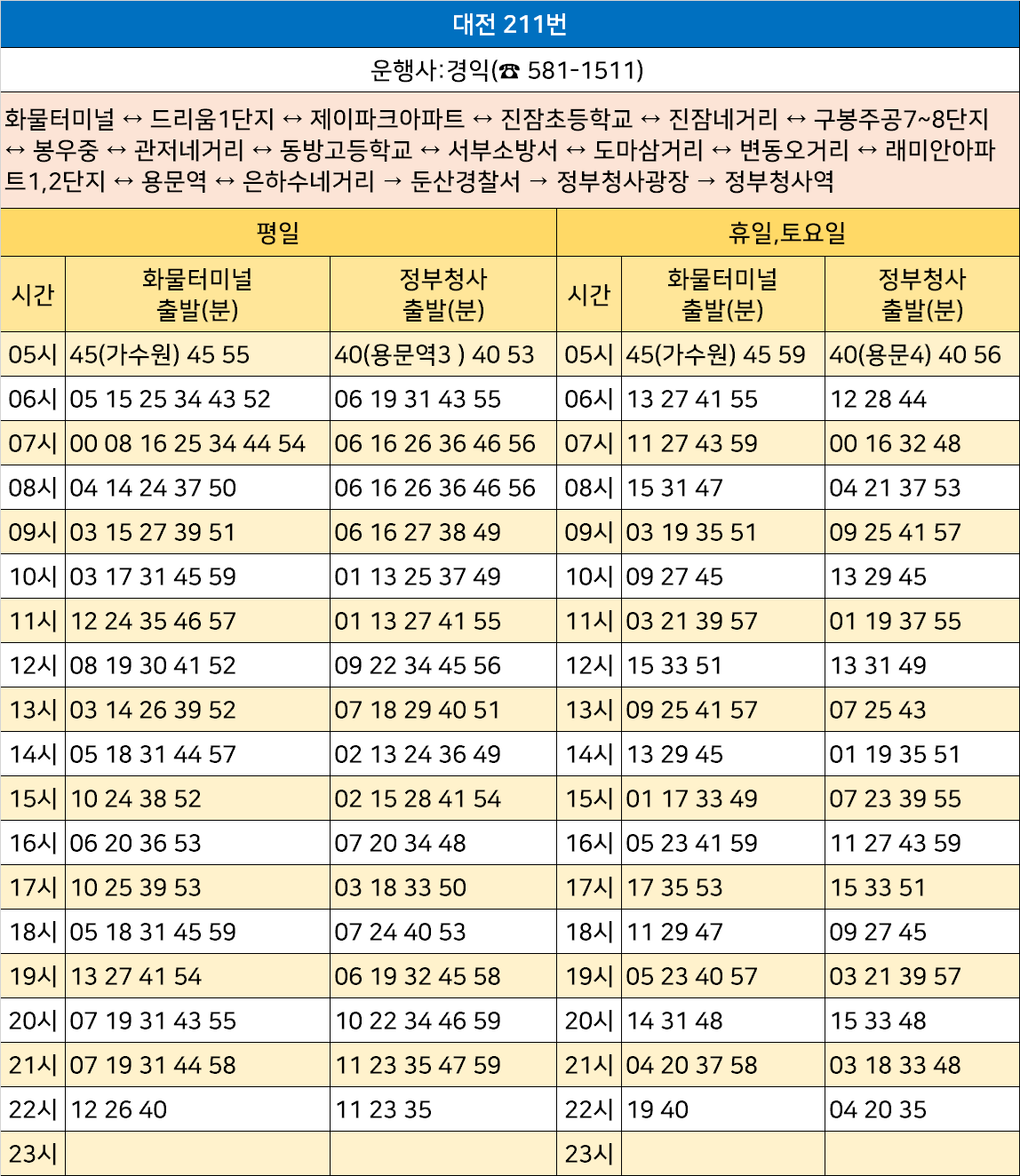 대전 211번: 화물터미널 ↔ 드리움1단지 ↔ 제이파크아파트 ↔ 진잠초등학교 ↔ 진잠네거리 ↔ 구봉주공7~8단지 ↔ 봉우중 ↔ 관저네거리 ↔ 동방고등학교 ↔ 서부소방서 ↔ 도마삼거리 ↔ 변동오거리 ↔ 래미안아파트1,2단지 ↔ 용문역 ↔ 은하수네거리 → 둔산경찰서 → 정부청사광장 → 정부청사역