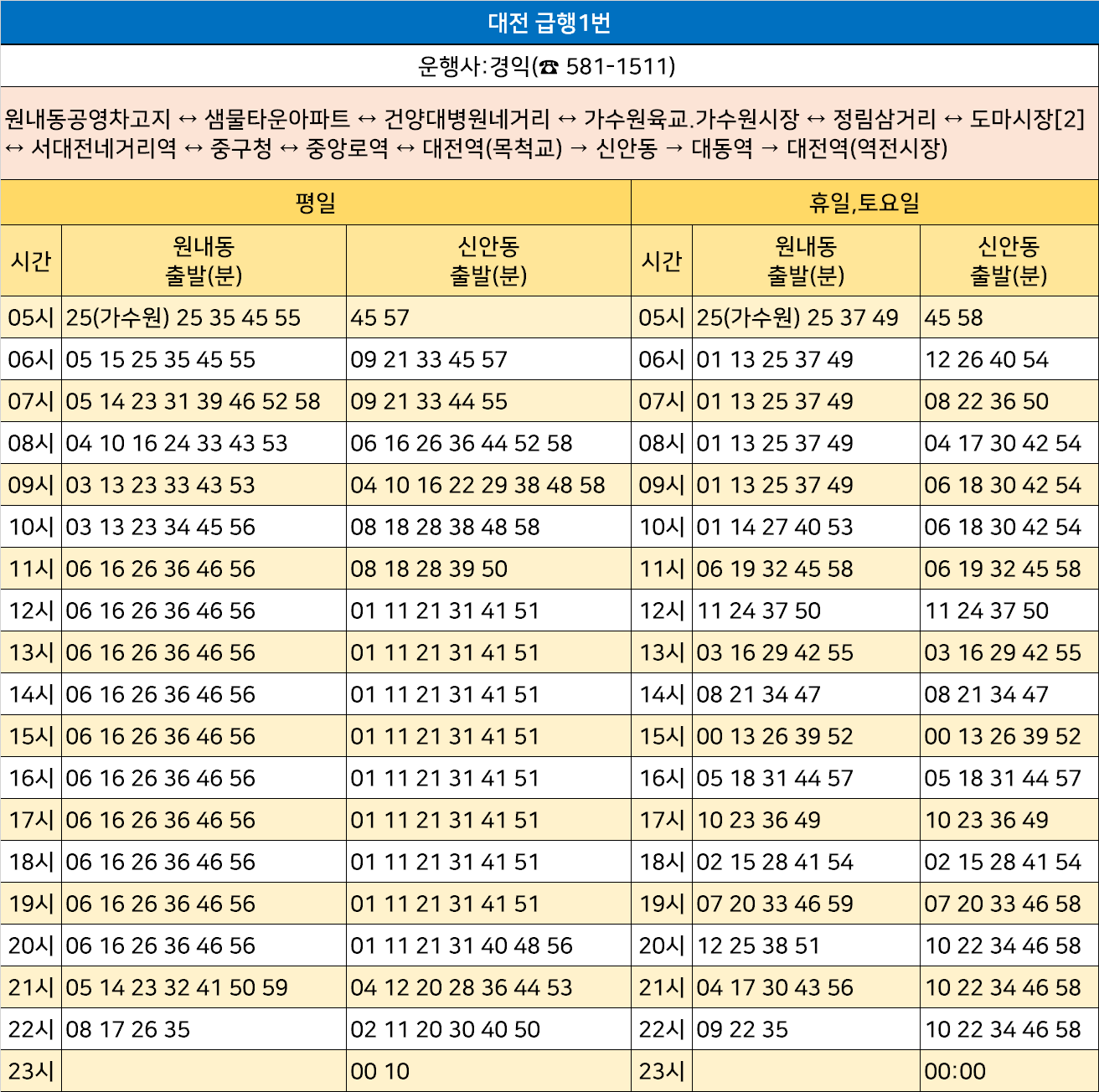대전 급행1번: 원내동공영차고지 ↔ 샘물타운아파트 ↔ 건양대병원네거리 ↔ 가수원육교.가수원시장 ↔ 정림삼거리 ↔ 도마시장[2] ↔ 서대전네거리역 ↔ 중구청 ↔ 중앙로역 ↔ 대전역(목척교) → 신안동 → 대동역 → 대전역(역전시장)