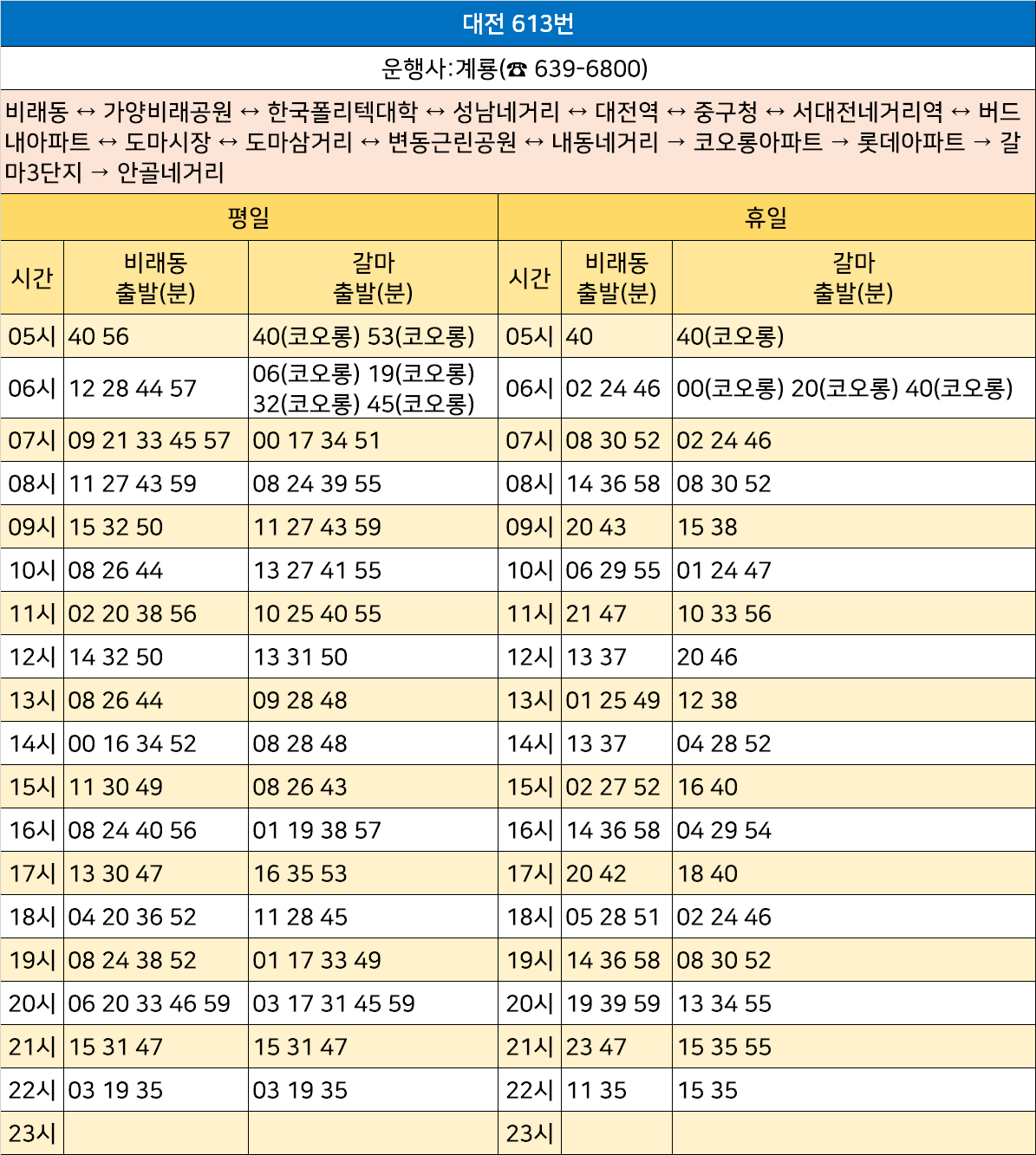 대전 613번: 비래동 ↔ 가양비래공원 ↔ 한국폴리텍대학 ↔ 성남네거리 ↔ 대전역 ↔ 중구청 ↔ 서대전네거리역 ↔ 버드내아파트 ↔ 도마시장 ↔ 도마삼거리 ↔ 변동근린공원 ↔ 내동네거리 → 코오롱아파트 → 롯데아파트 → 갈마3단지 → 안골네거리