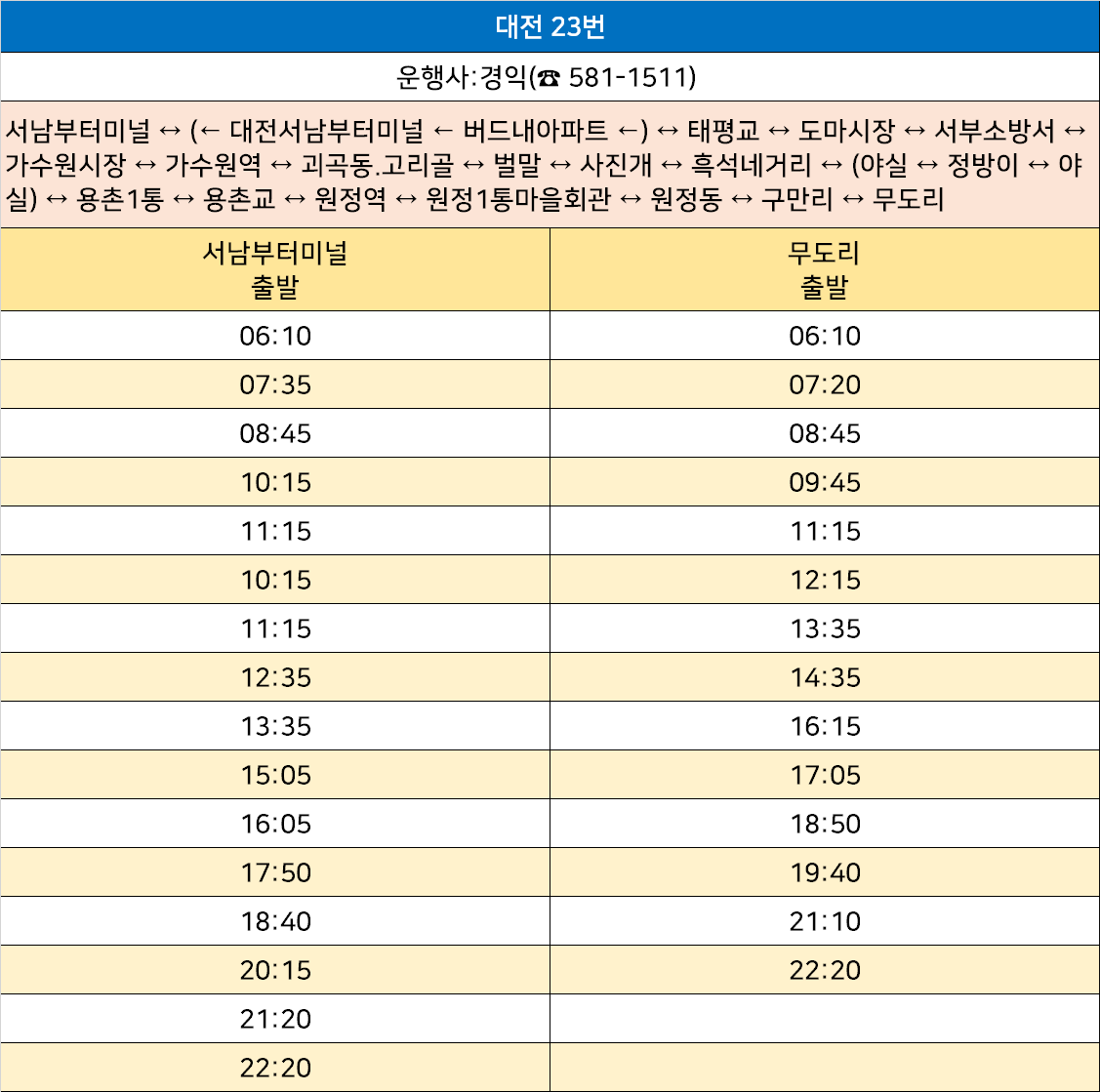 대전 23번: 서남부터미널 ↔ (← 대전서남부터미널 ← 버드내아파트 ←) ↔ 태평교 ↔ 도마시장 ↔ 서부소방서 ↔ 가수원시장 ↔ 가수원역 ↔ 괴곡동.고리골 ↔ 벌말 ↔ 사진개 ↔ 흑석네거리 ↔ (야실 ↔ 정방이 ↔ 야실) ↔ 용촌1통 ↔ 용촌교 ↔ 원정역 ↔ 원정1통마을회관 ↔ 원정동 ↔ 구만리 ↔ 무도리