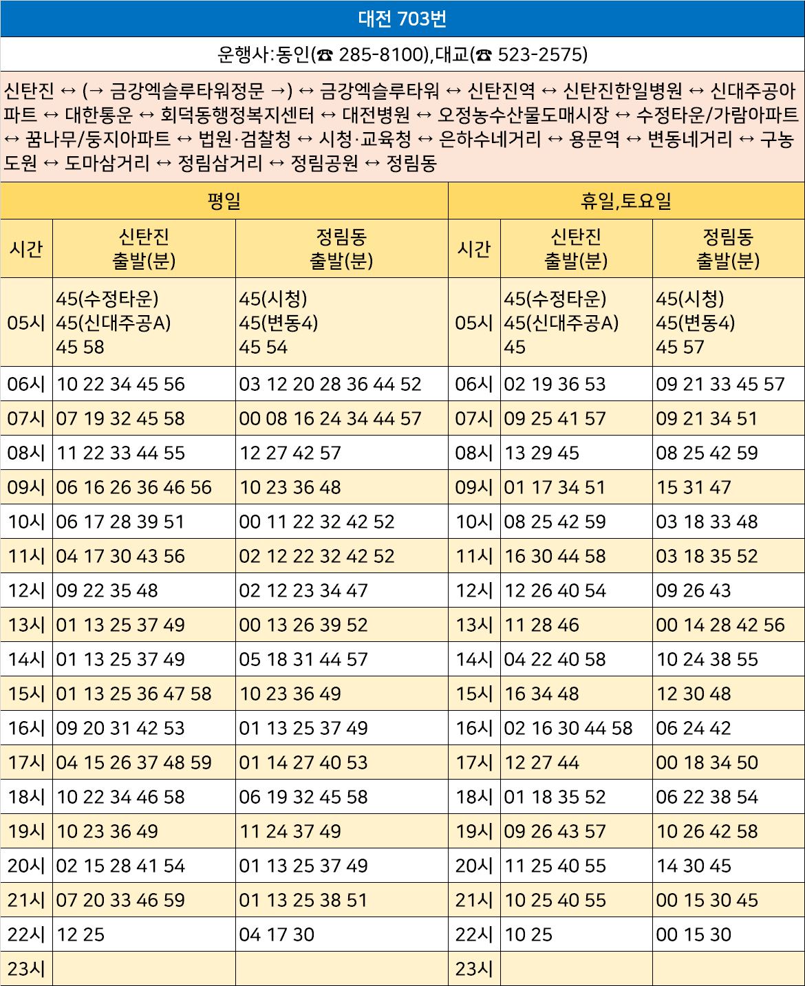 대전 703번: 신탄진 ↔ (→ 금강엑슬루타워정문 →) ↔ 금강엑슬루타워 ↔ 신탄진역 ↔ 신탄진한일병원 ↔ 신대주공아파트 ↔ 대한통운 ↔ 회덕동행정복지센터 ↔ 대전병원 ↔ 오정농수산물도매시장 ↔ 수정타운/가람아파트 ↔ 꿈나무/둥지아파트 ↔ 법원·검찰청 ↔ 시청·교육청 ↔ 은하수네거리 ↔ 용문역 ↔ 변동네거리 ↔ 구농도원 ↔ 도마삼거리 ↔ 정림삼거리 ↔ 정림공원 ↔ 정림동