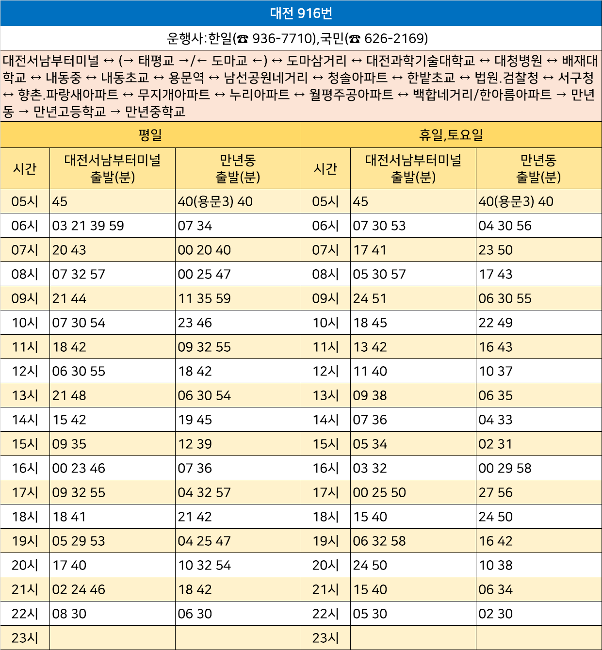 대전 916번: 대전서남부터미널 ↔ (→ 태평교 →/← 도마교 ←) ↔ 도마삼거리 ↔ 대전과학기술대학교 ↔ 대청병원 ↔ 배재대학교 ↔ 내동중 ↔ 내동초교 ↔ 용문역 ↔ 남선공원네거리 ↔ 청솔아파트 ↔ 한밭초교 ↔ 법원.검찰청 ↔ 서구청 ↔ 향촌.파랑새아파트 ↔ 무지개아파트 ↔ 누리아파트 ↔ 월평주공아파트 ↔ 백합네거리/한아름아파트 → 만년동 → 만년고등학교 → 만년중학교