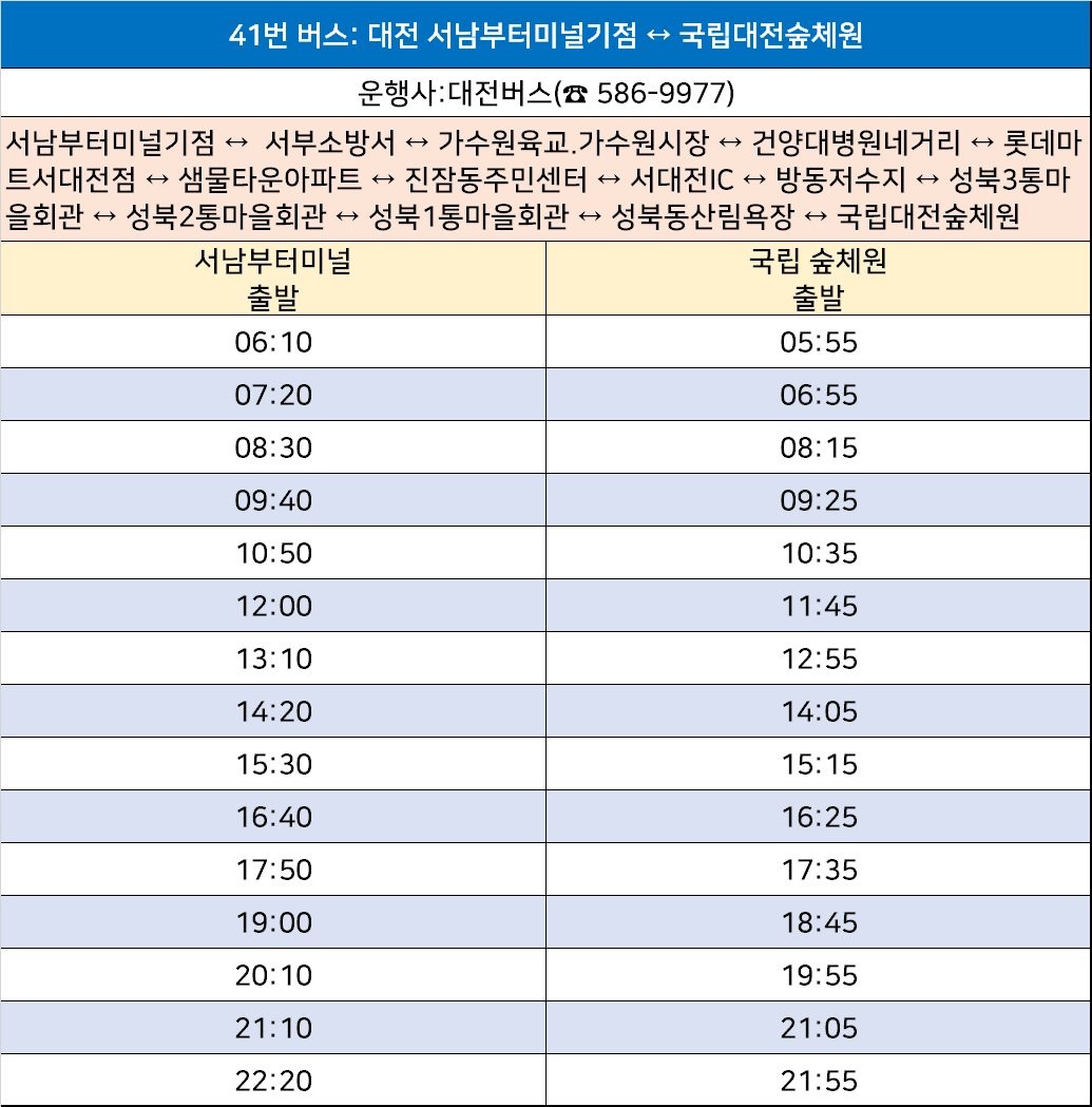 대전 41번: 서남부터미널기점 ↔ 서부소방서 ↔ 가수원육교.가수원시장 ↔ 건양대병원네거리 ↔ 롯데마트서대전점 ↔ 샘물타운아파트 ↔ 진잠동주민센터 ↔ 서대전IC ↔ 방동저수지 ↔ 성북3통마을회관 ↔ 성북2통마을회관 ↔ 성북1통마을회관 ↔ 성북동산림욕장 ↔ 국립대전숲체원