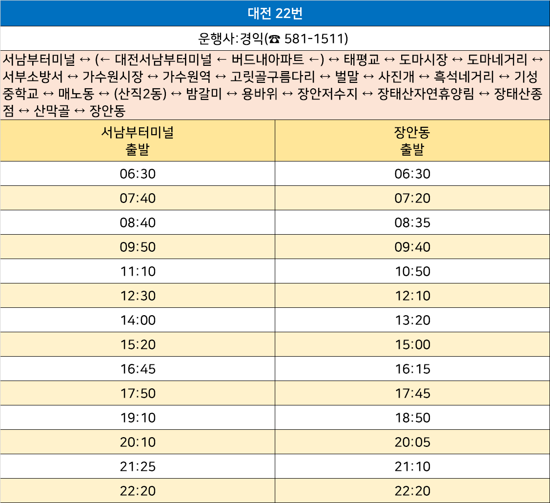 대전 22번: 서남부터미널 ↔ (← 대전서남부터미널 ← 버드내아파트 ←) ↔ 태평교 ↔ 도마시장 ↔ 도마네거리 ↔ 서부소방서 ↔ 가수원시장 ↔ 가수원역 ↔ 고릿골구름다리 ↔ 벌말 ↔ 사진개 ↔ 흑석네거리 ↔ 기성중학교 ↔ 매노동 ↔ (산직2동) ↔ 밤갈미 ↔ 용바위 ↔ 장안저수지 ↔ 장태산자연휴양림 ↔ 장태산종점 ↔ 산막골 ↔ 장안동