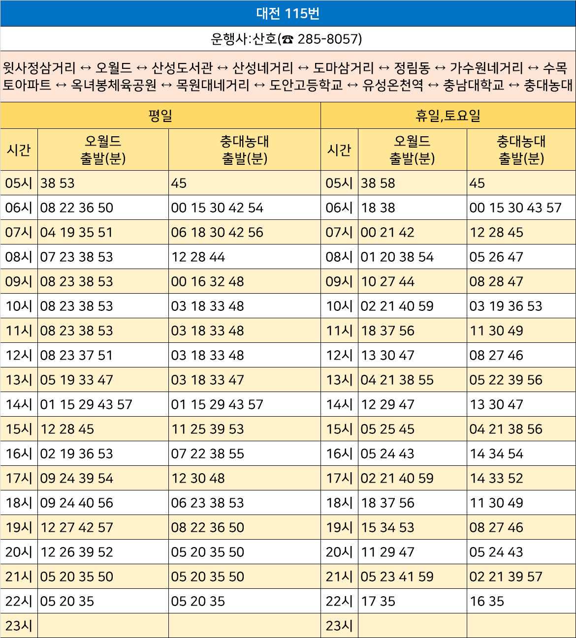 대전 115번: 윗사정삼거리 ↔ 오월드 ↔ 산성도서관 ↔ 산성네거리 ↔ 도마삼거리 ↔ 정림동 ↔ 가수원네거리 ↔ 수목토아파트 ↔ 옥녀봉체육공원 ↔ 목원대네거리 ↔ 도안고등학교 ↔ 유성온천역 ↔ 충남대학교 ↔ 충대농대
