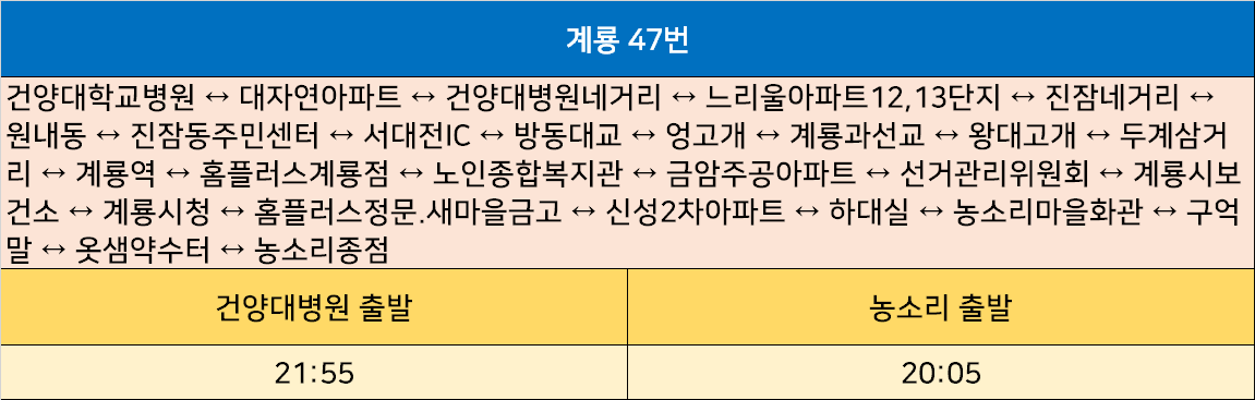 계룡 47번: 건양대학교병원 ↔ 대자연아파트 ↔ 건양대병원네거리 ↔ 느리울아파트12,13단지 ↔ 진잠네거리 ↔ 원내동 ↔ 진잠동주민센터 ↔ 서대전IC ↔ 방동대교 ↔ 엉고개 ↔ 계룡과선교 ↔ 왕대고개 ↔ 두계삼거리 ↔ 계룡역 ↔ 홈플러스계룡점 ↔ 노인종합복지관 ↔ 금암주공아파트 ↔ 선거관리위원회 ↔ 계룡시보건소 ↔ 계룡시청 ↔ 홈플러스정문.새마을금고 ↔ 신성2차아파트 ↔ 하대실 ↔ 농소리마을화관 ↔ 구억말 ↔ 옷샘약수터 ↔ 농소리종점
