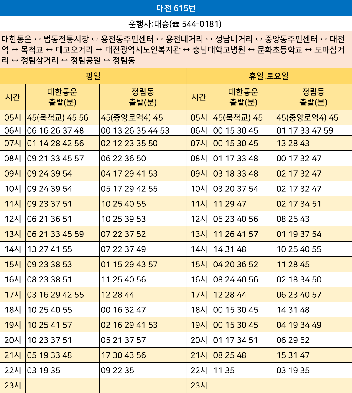 대전 615번: 대한통운 ↔ 법동전통시장 ↔ 용전동주민센터 ↔ 용전네거리 ↔ 성남네거리 ↔ 중앙동주민센터 ↔ 대전역 ↔ 목척교 ↔ 대고오거리 ↔ 대전광역시노인복지관 ↔ 충남대학교병원 ↔ 문화초등학교 ↔ 도마삼거리 ↔ 정림삼거리 ↔ 정림공원 ↔ 정림동