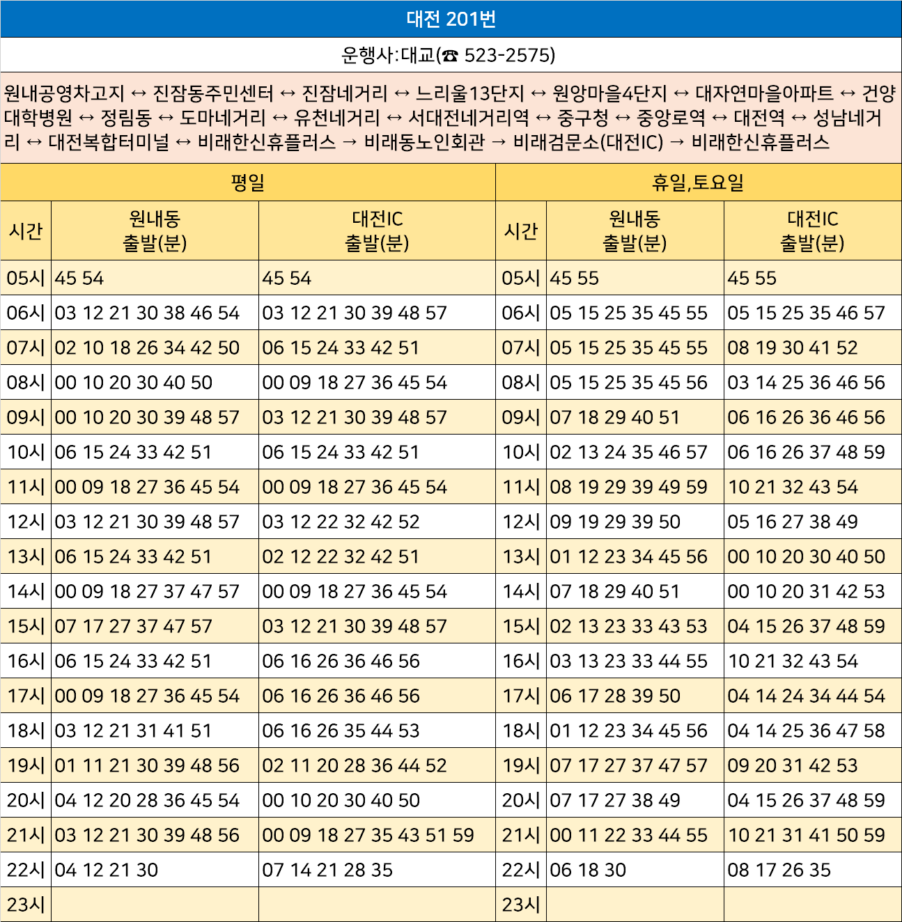 대전 201번: 원내공영차고지 ↔ 진잠동주민센터 ↔ 진잠네거리 ↔ 느리울13단지 ↔ 원앙마을4단지 ↔ 대자연마을아파트 ↔ 건양대학병원 ↔ 정림동 ↔ 도마네거리 ↔ 유천네거리 ↔ 서대전네거리역 ↔ 중구청 ↔ 중앙로역 ↔ 대전역 ↔ 성남네거리 ↔ 대전복합터미널 ↔ 비래한신휴플러스 → 비래동노인회관 → 비래검문소(대전IC) → 비래한신휴플러스