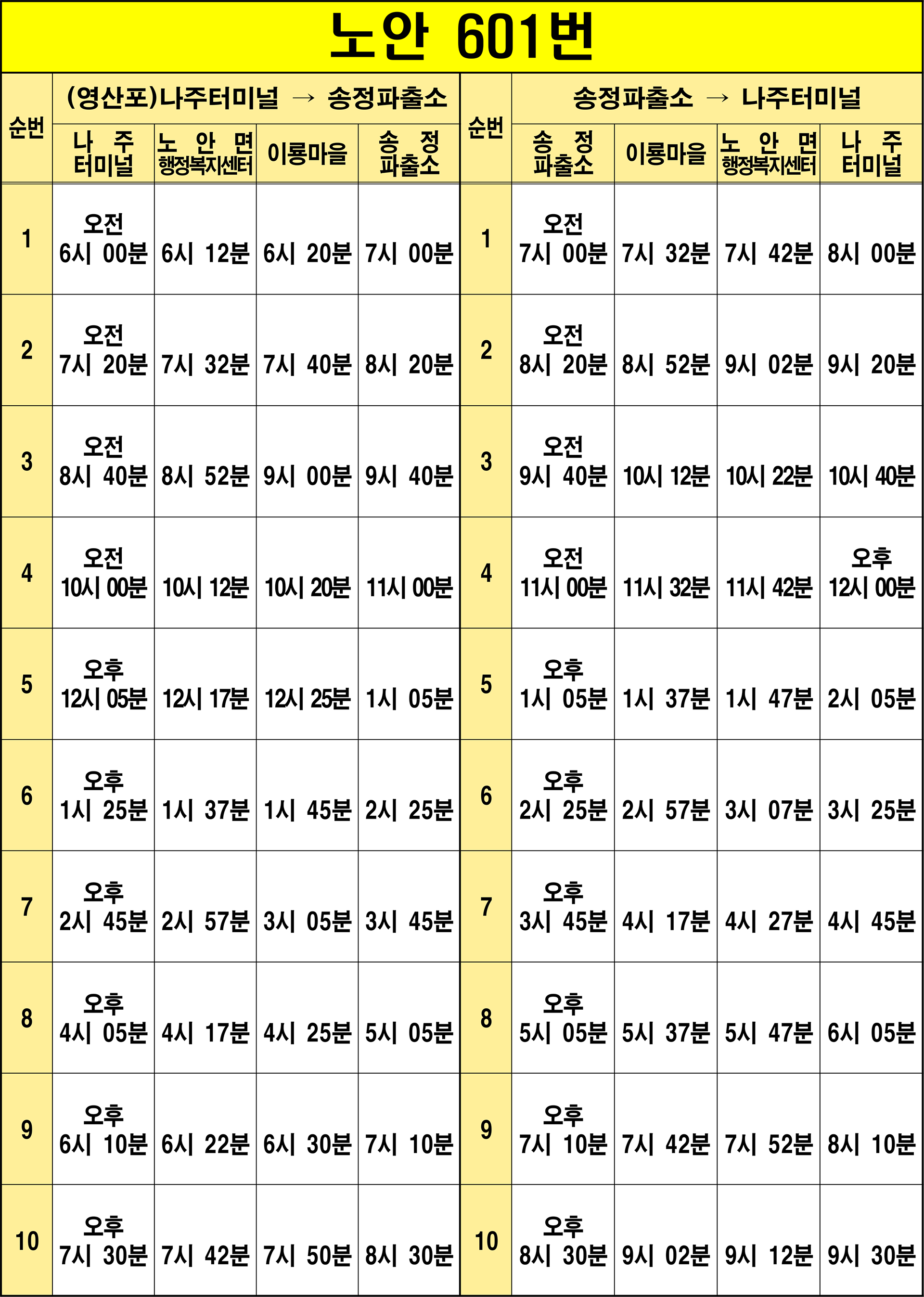 나주 601번: 1. 나주터미널(기점/환승) → 2. 목사고을시장 → 3. 호반아파트 → 4. 대방아파트 → 5. 정렬사입구 → 6. 정렬사 → 7. 싸이클경기장 → 8. 동신대학교 → 9. 호반아파트 → 10. 나주북초등학교 → 11. 청동 → 12. 석현동 → 13. 신동산 → 14. 노안역 → 15. 장림 → 16. 노안사거리 → 17. 노안면행정복지센터(환승) → 18. 구노안면사무소 → 19. 제일의원앞 → 20. 금암천주교 → 21. 황계 → 22. 신암마을 → 23. 회룡 → 24. 신암 → 25. 계동 → 26. 덕림 → 27. 이룡 → 28. 오정 → 29. 장등 → 30. 계량 → 31. 송학 → 32. 광산유스호스텔 → 33. 신동 → 34. 송학입구 → 35. 대산삼거리 → 36. 대산 → 37. 신광 → 38. 도야 → 39. 회룡(광산구) → 40. 연동 → 41. 월곡마을 → 42. 명동삼거리 → 43. 명화동 → 44. 축산시험장 → 45. 용강입구 → 46. 기곡 → 47. 용곡입구 → 48. 평동초교 → 49. 옥동.평동방부병원 → 50. 평동우체국 → 51. 평동역(동) → 52. 평동역주차장 → 53. 꽃동네 → 54. 장록 → 55. 검문소 → 56. 신덕마을 → 57. 신동사거리 → 58. 광주송정역 → 59. 광산구청 → 60. 영광통 → 61. 송정공원역 → 62. 송정파출소(회차지) → 63. 송정파출소(회차 기점) → 64. 송정공원역 → 65. 영광통 → 66. 광산구청 → 67. 광주송정역 → 68. 신동사거리 → 69. 신덕마을 → 70. 검문소 → 71. 장록 → 72. 꽃동네 → 73. 월전(광산구) → 74. 평동역(서) → 75. 평동우체국 → 76. 옥동 → 77. 평동초교 → 78. 용곡입구 → 79. 기곡 → 80. 용강입구 → 81. 축산시험장 → 82. 명화동 → 83. 명동삼거리 → 84. 월곡마을 → 85. 연동 → 86. 회룡(광산구) → 87. 도야 → 88. 신광(삼도) → 89. 대산 → 90. 대산삼거리 → 91. 송학입구 → 92. 신동 → 93. 광산유스호스텔 → 94. 송학 → 95. 계량 → 96. 장등 → 97. 오정 → 98. 이룡 → 99. 덕림 → 100. 계동 → 101. 신암 → 102. 회룡 → 103. 신암마을 → 104. 황계 → 105. 금암천주교 → 106. 제일의원앞 → 107. 구노안면사무소 → 108. 노안면행정복지센터(환승) → 109. 노안사거리 → 110. 장림 → 111. 노안역 → 112. 노안교회.신동산 → 113. 구노안역 → 114. 석현동 → 115. 청동입구 → 116. 나주북초등학교 → 117. 호반아파트 → 118. 동신대학교 → 119. 싸이클경기장 → 120. 정렬사 → 121. 정렬사입구 → 122. 대방아파트 → 123. 호반아파트 → 124. 나주여고 → 125. 나주터미널(종점/환승)